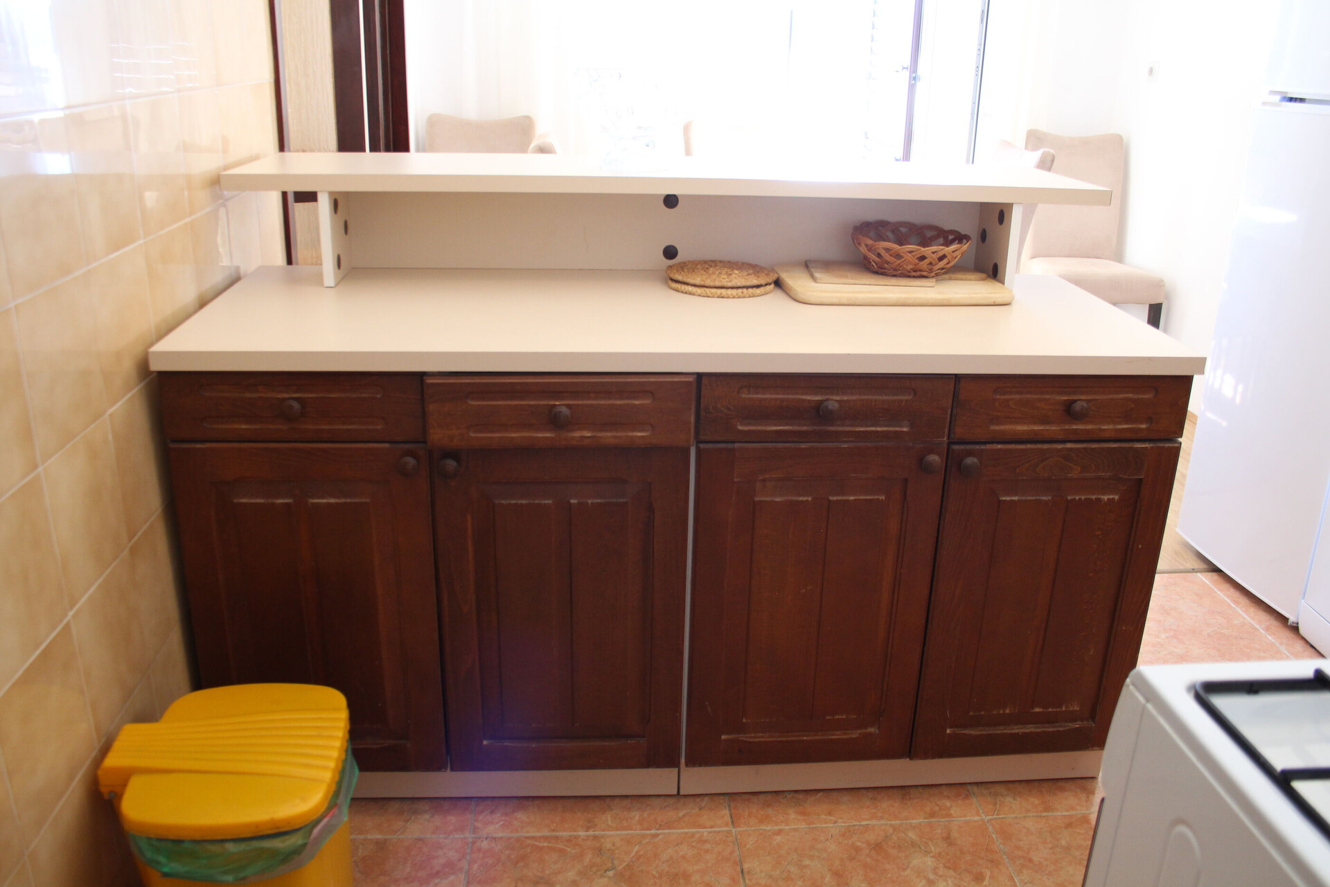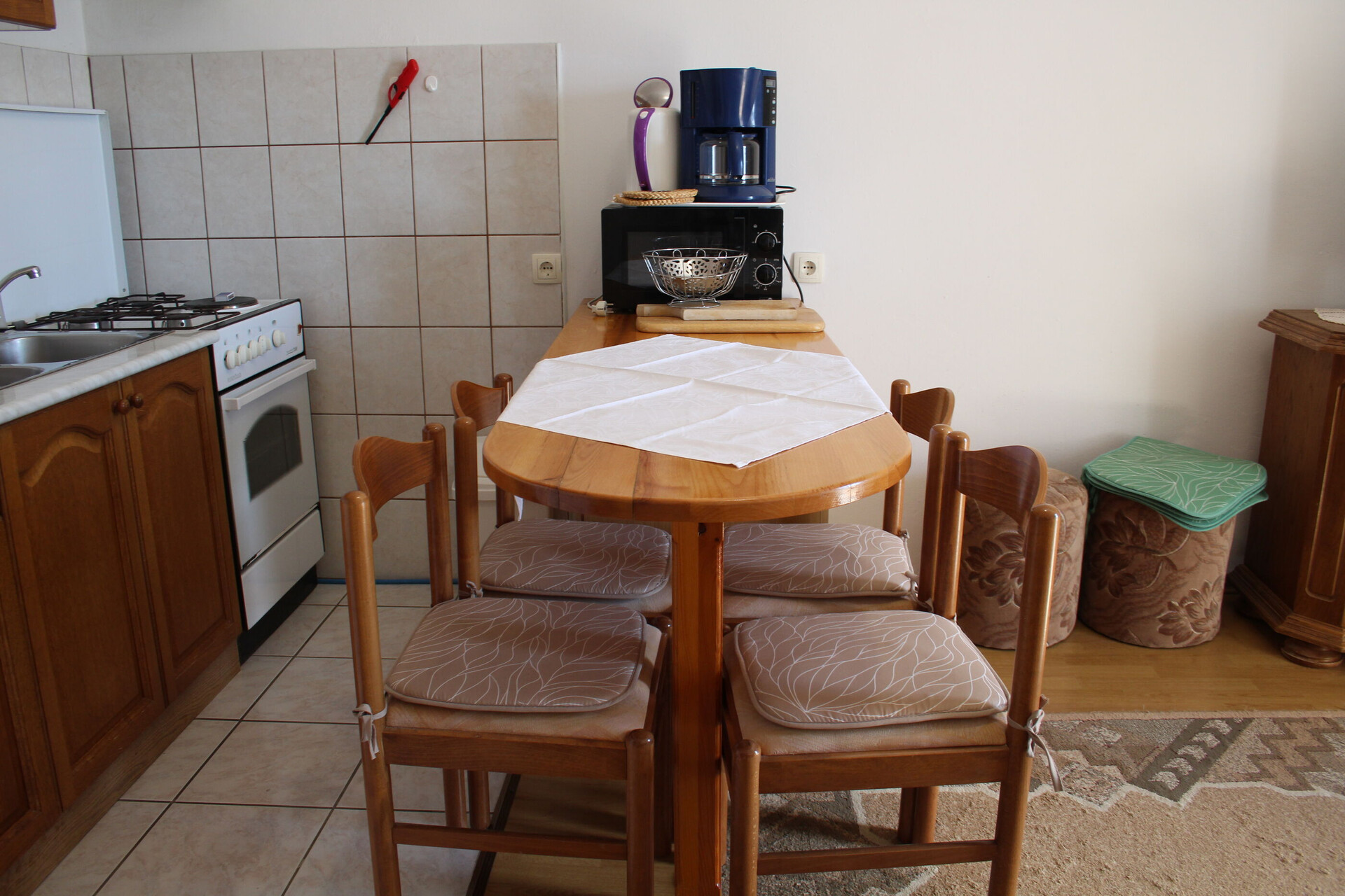 • stůl a židle, dřez, trouba, lednička, varná konvice, kávovar, myčka na nádobí, sporák varná deska.