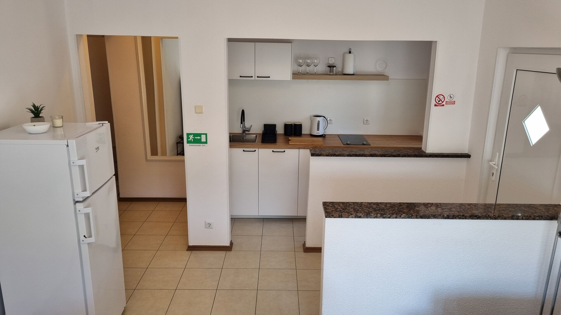 • stůl a židle, dřez, lednička, mražák, varná konvice, kávovar, myčka na nádobí, žehlička, sporák varná deska.
