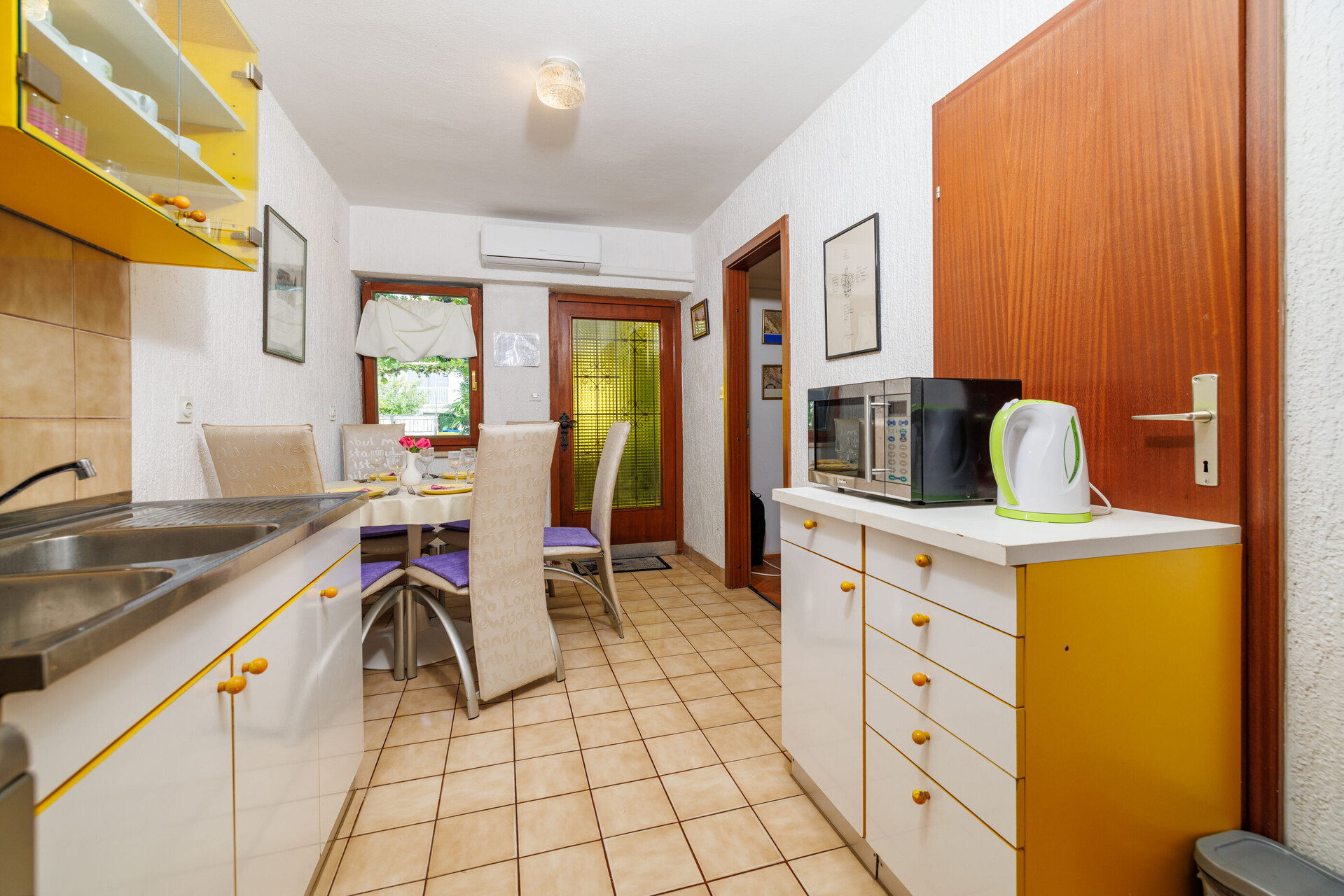 • stůl a židle, dřez, trouba, lednička, mražák, varná konvice, kávovar, Mikrovlná trouba, toaster, žehlička, sporák varná deska.