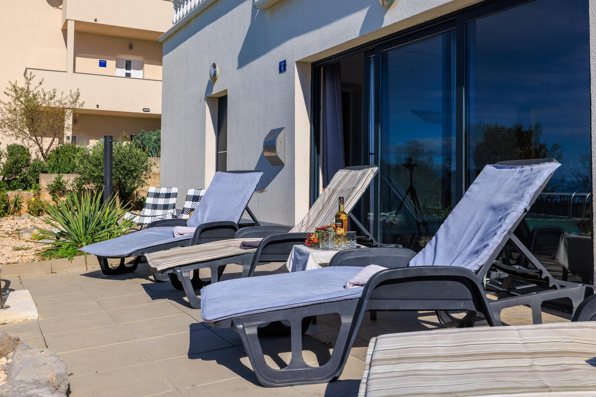 wi-fi zdarma, částečný pohled na moře, Rozloha vnitřního prostoru je 60 m2, Jednotka je na: v přízemí, Ložnice: 2, Koupelny: 1, Balkony: 1, klimatizace započítána v ceně.