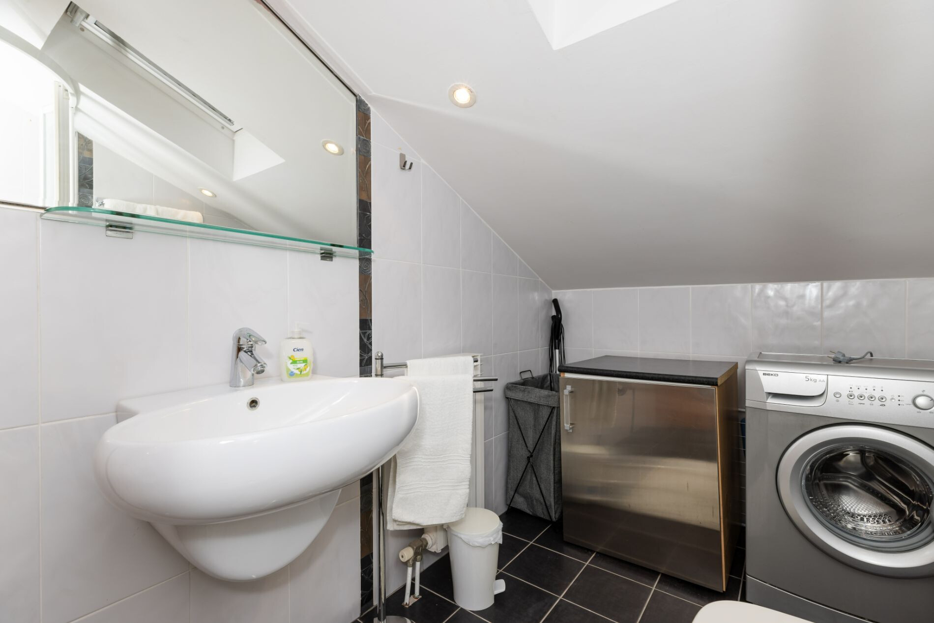 • sprcha, sprchový kout, pračka, ručníky.