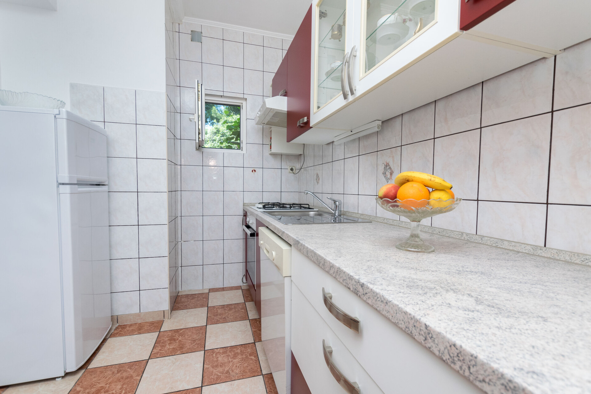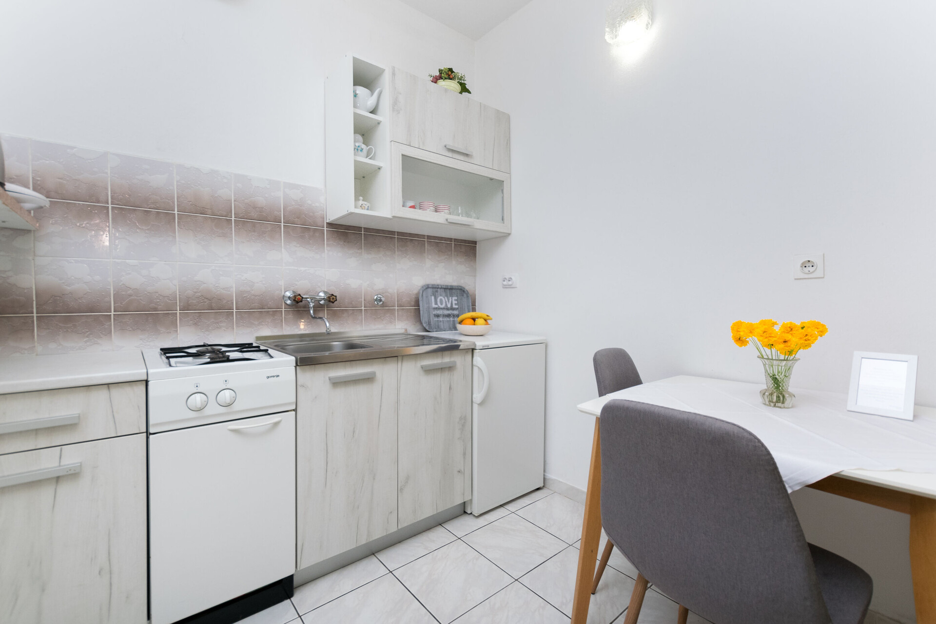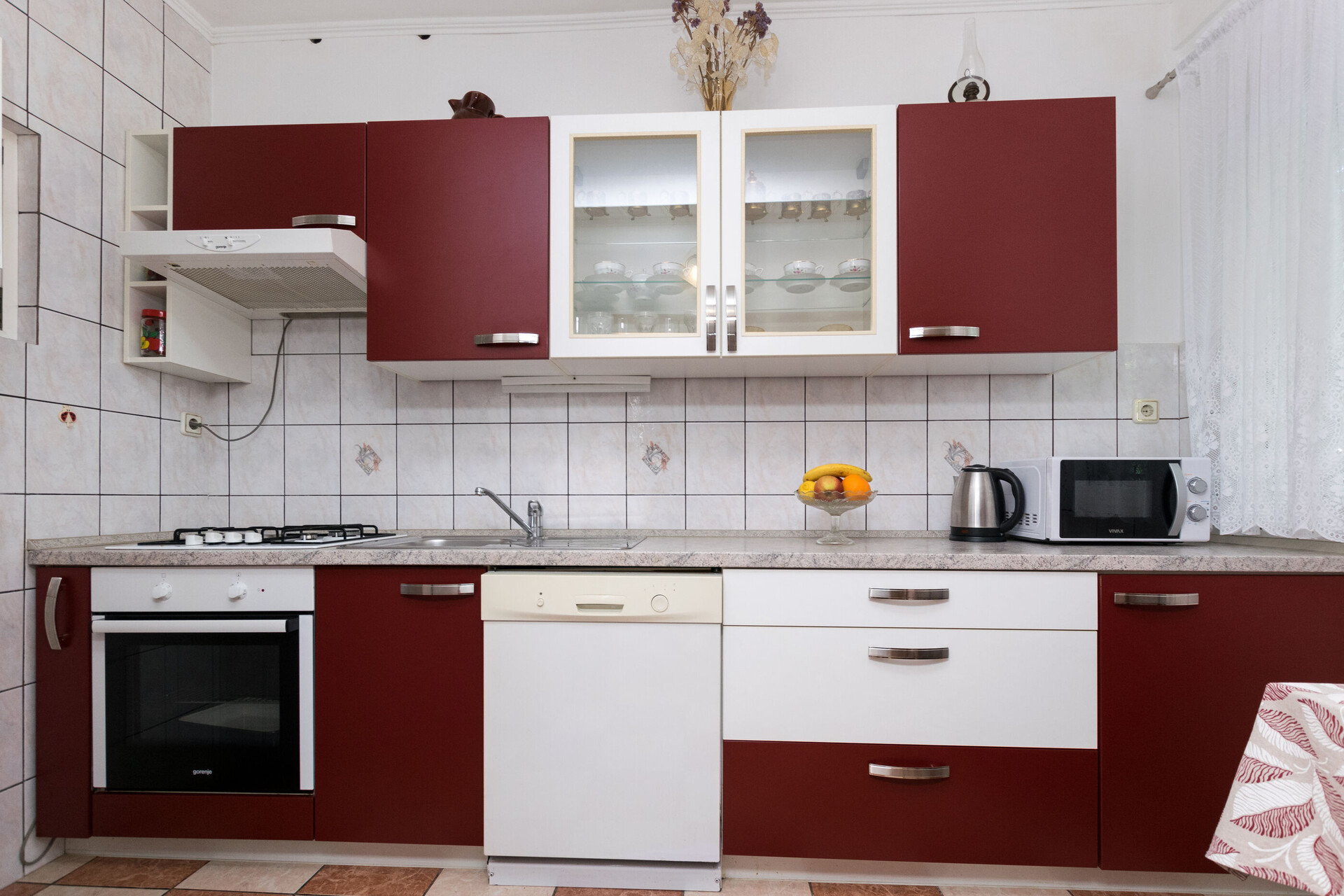• stůl a židle, dřez, trouba, lednička, mražák, varná konvice, kávovar, sporák varná deska.
