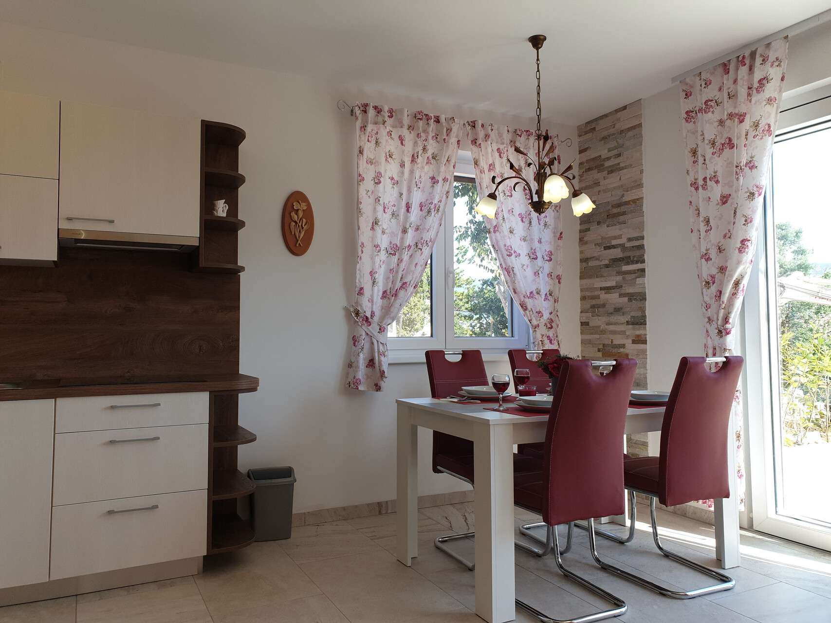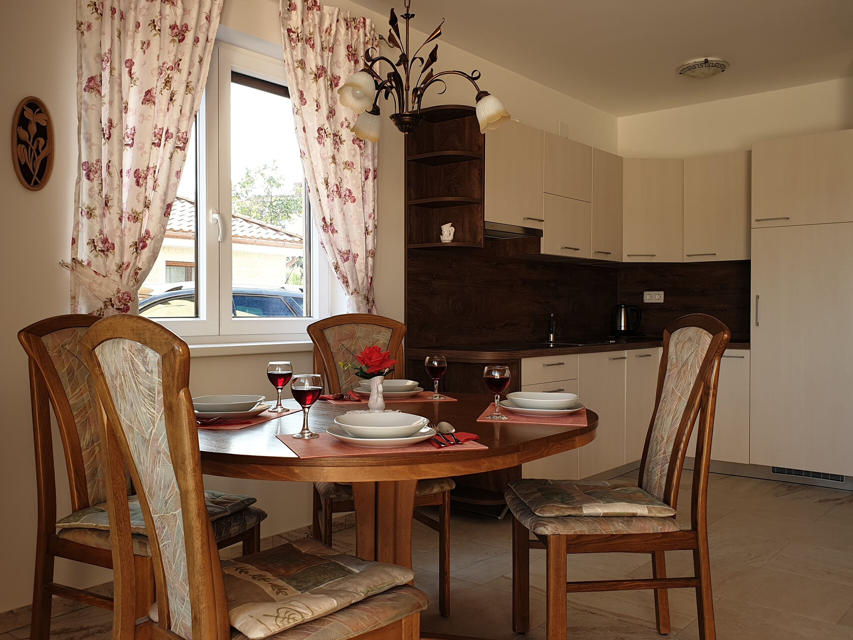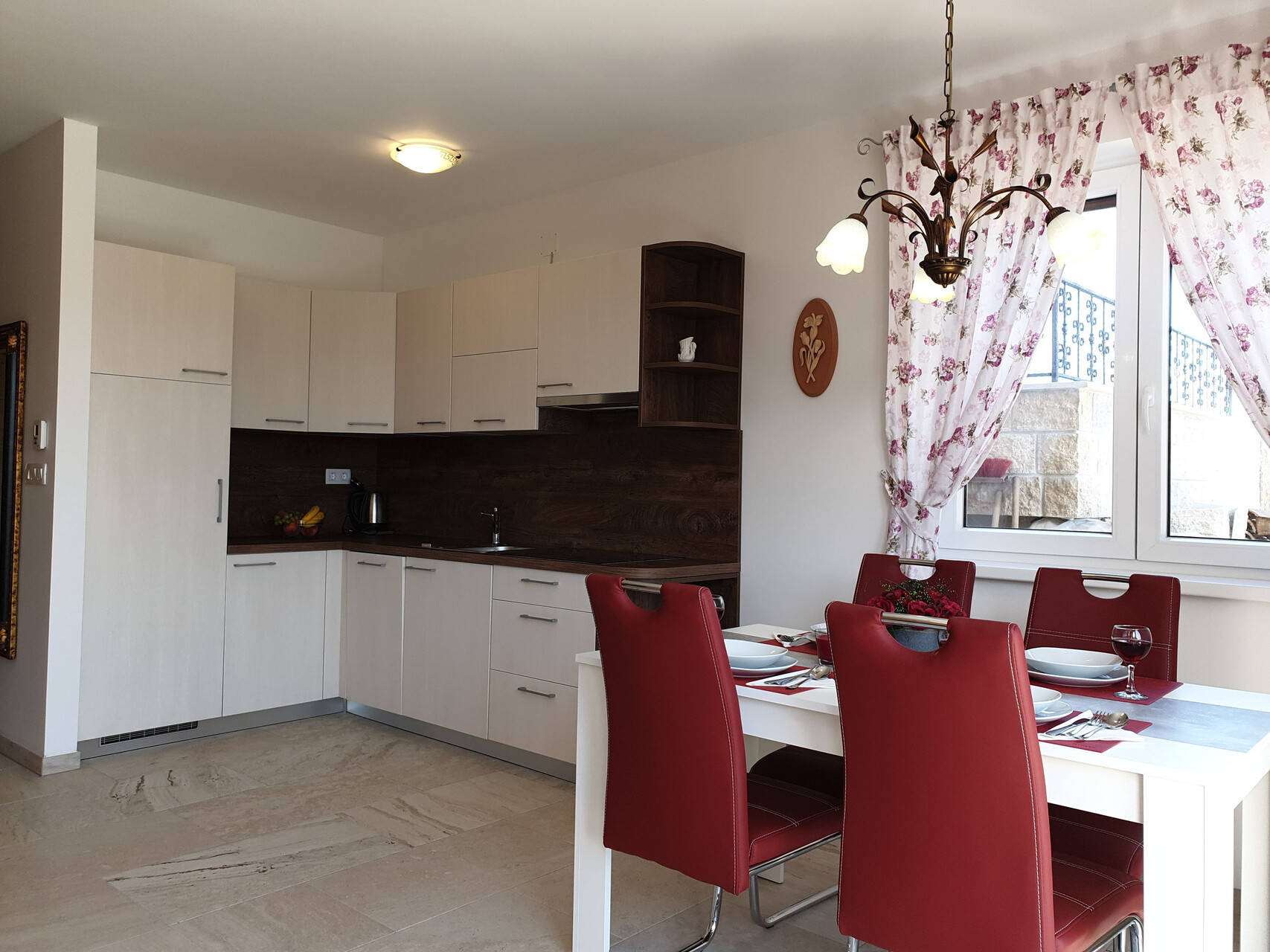 • stůl a židle, dřez, trouba, lednička, mražák, varná konvice, kávovar, myčka na nádobí, sporák varná deska.
