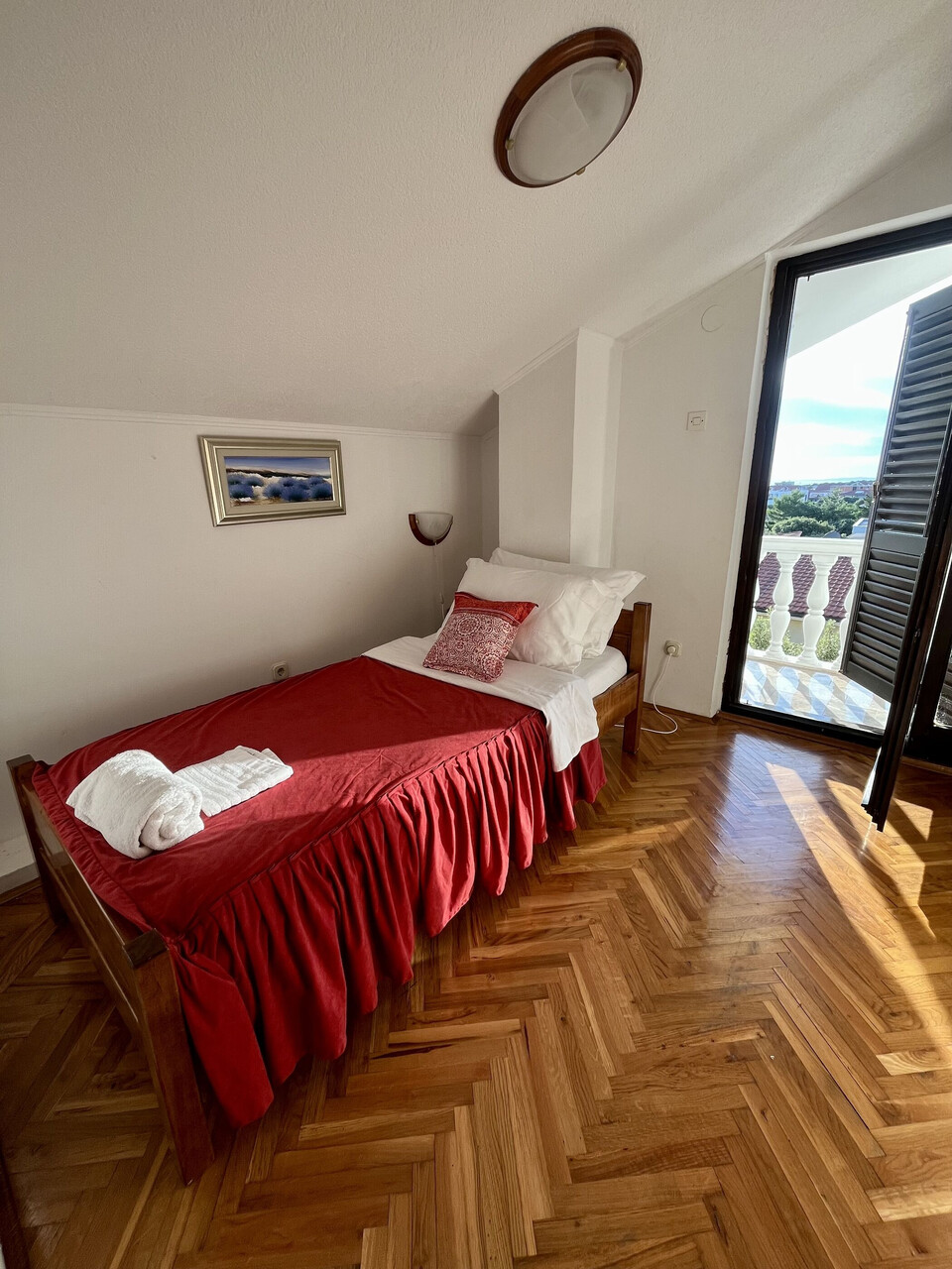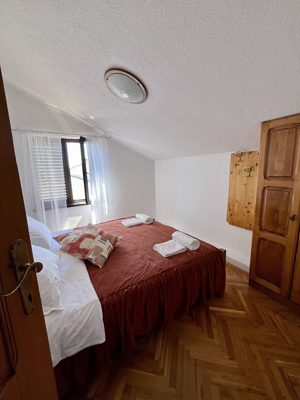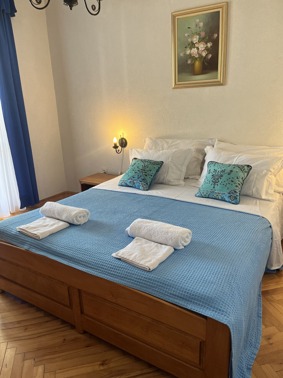 • Postele: manželská postel. Ložní prádlo je k dispozici. Z pokoje se vychází na balkon.
