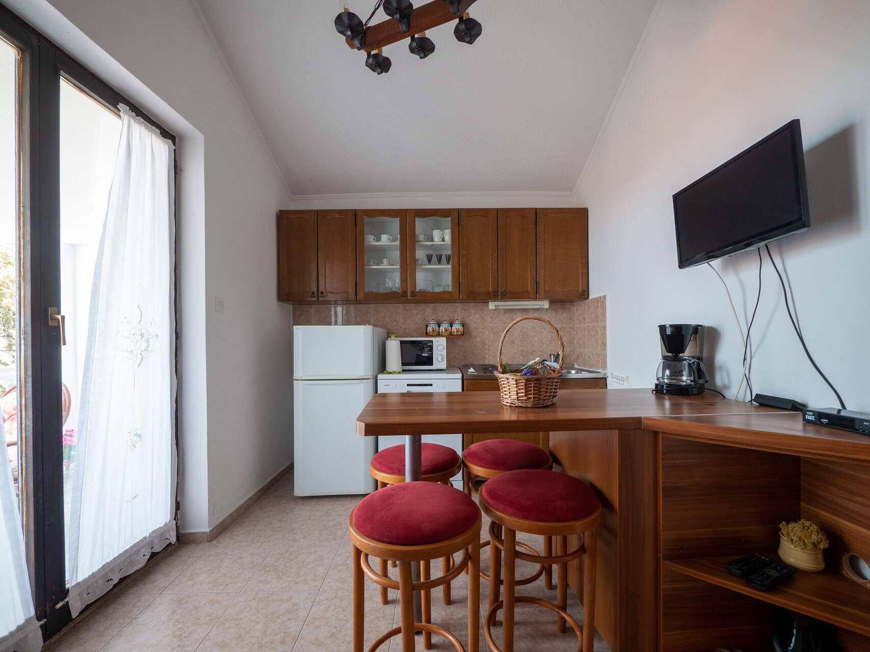• stůl a židle, dřez, lednička, varná konvice, kávovar, myčka na nádobí, žehlička, sporák varná deska.