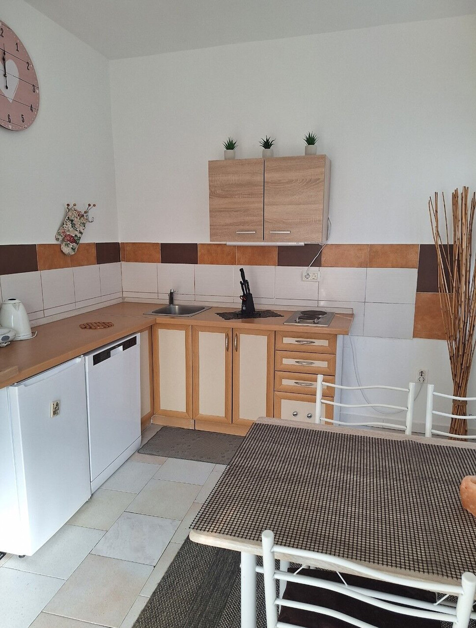 • stůl a židle, dřez, trouba, lednička, mražák, varná konvice, kávovar, toaster, sporák varná deska.
