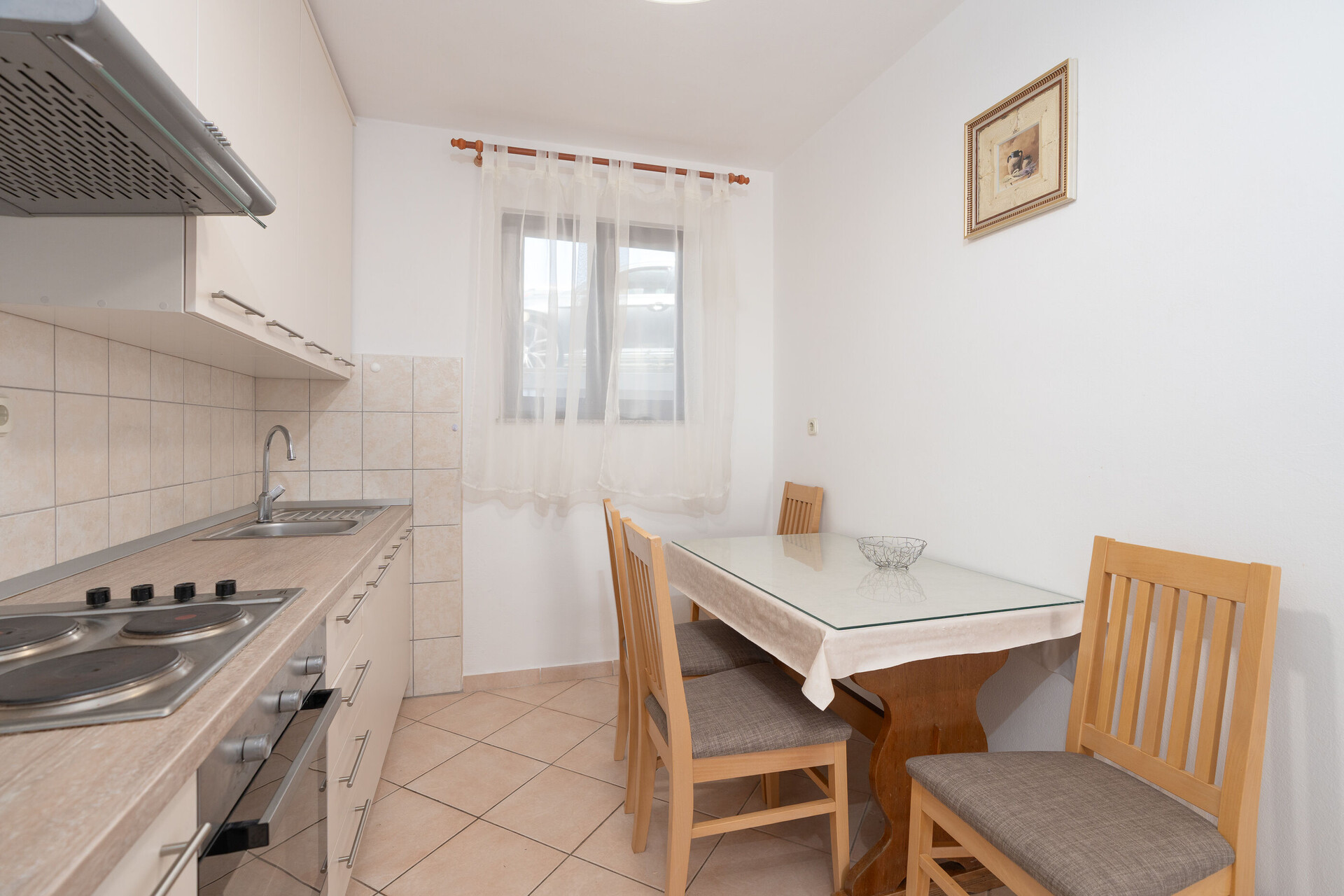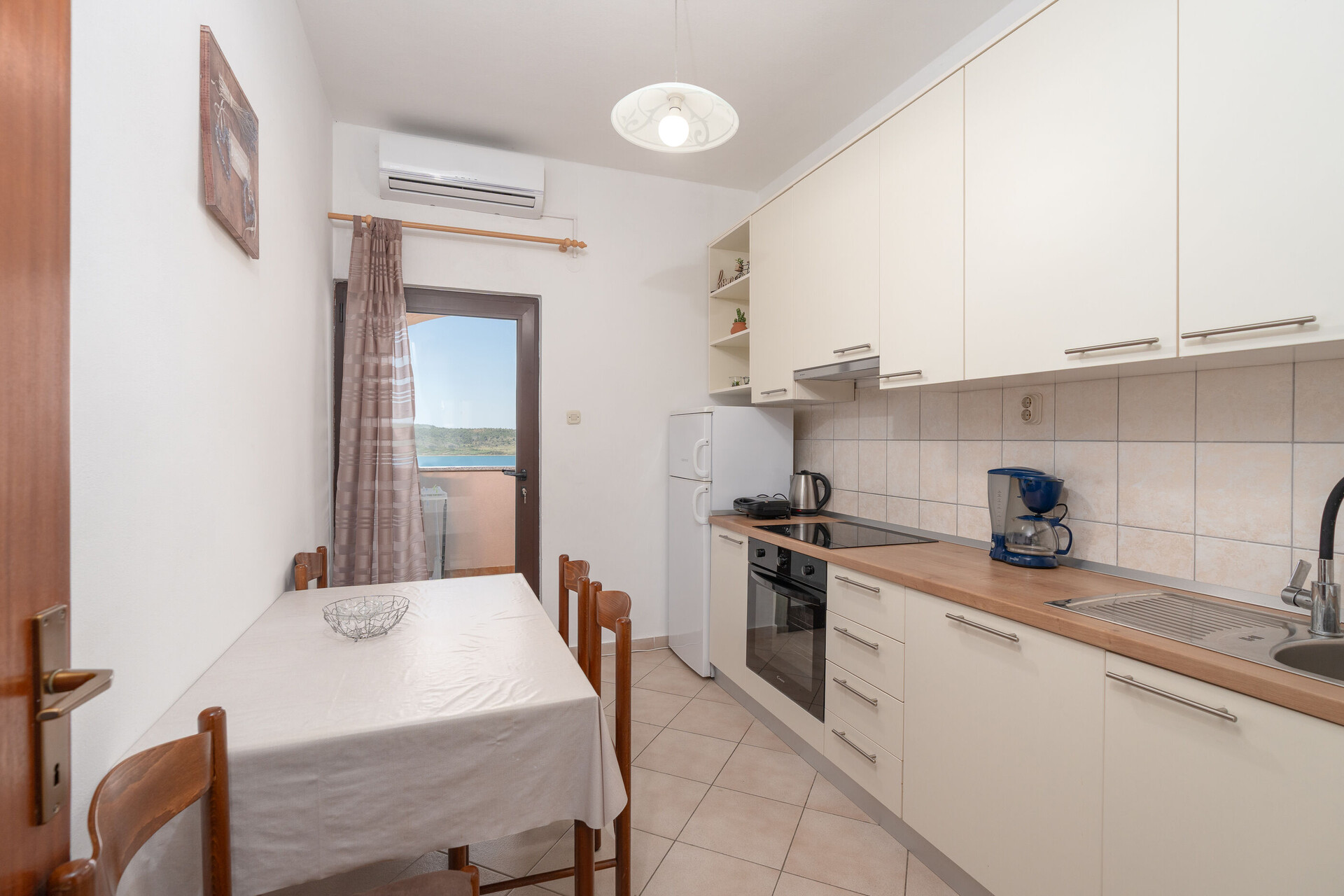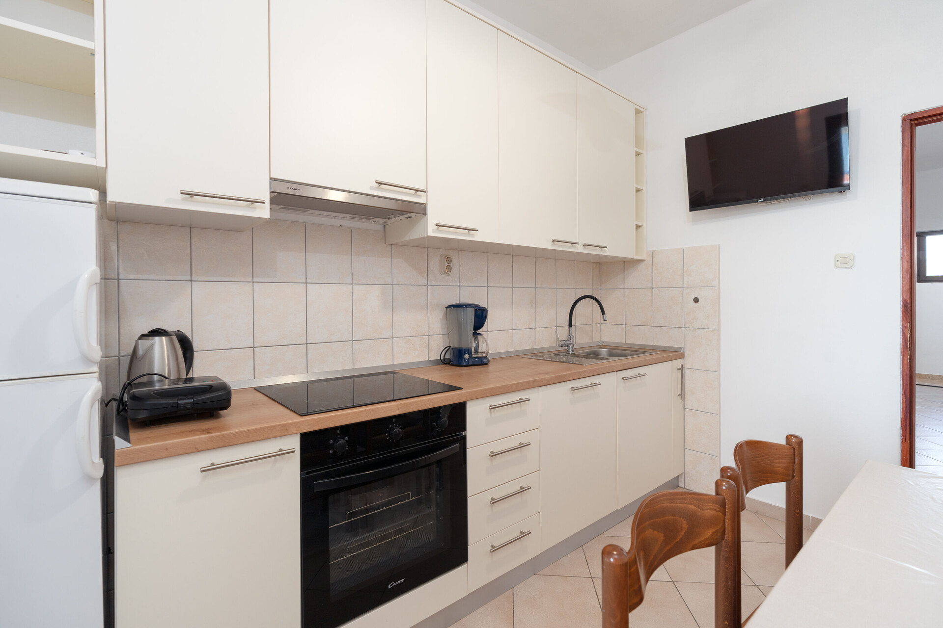 • stůl a židle, dřez, trouba, lednička, kávovar, toaster, sporák varná deska.