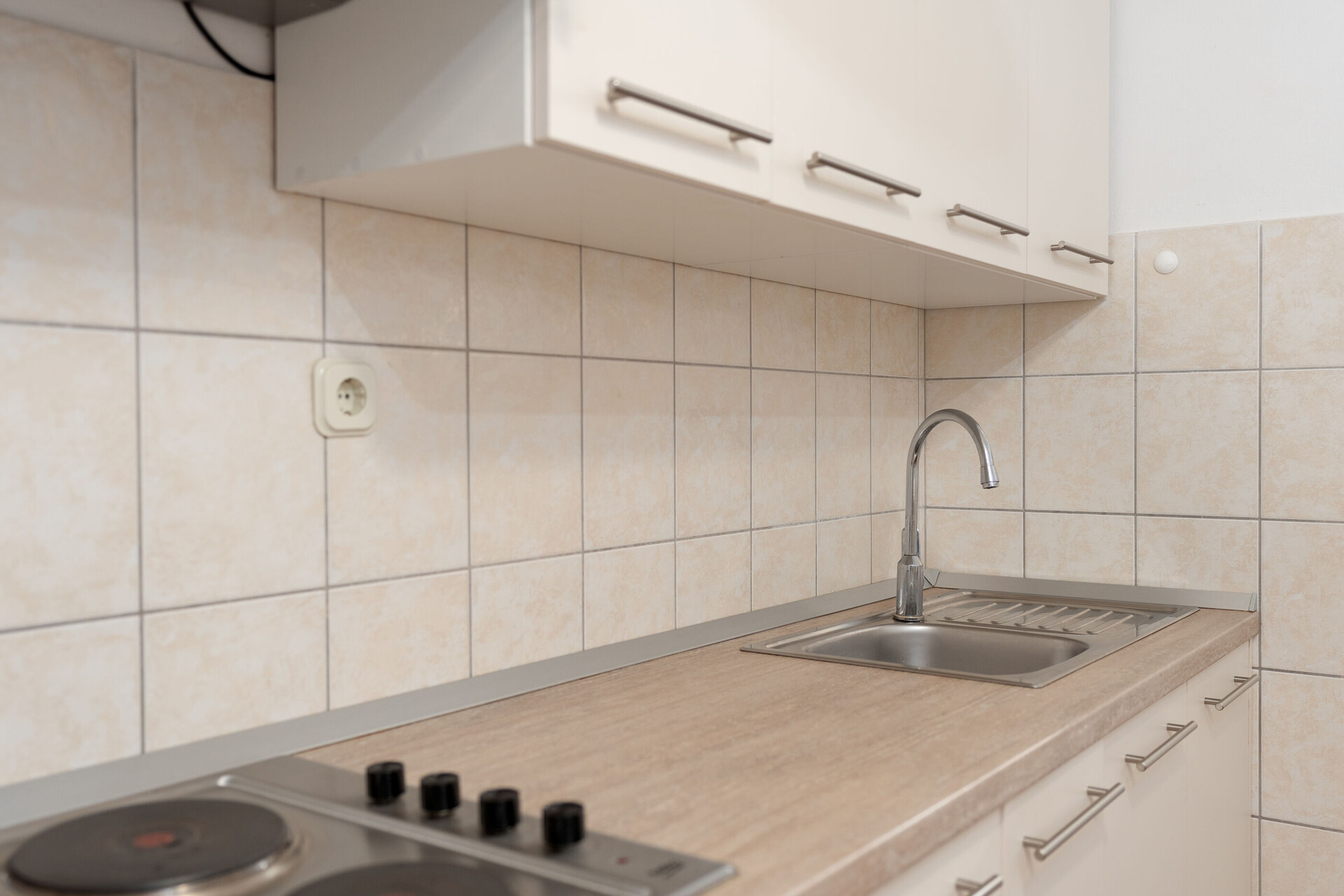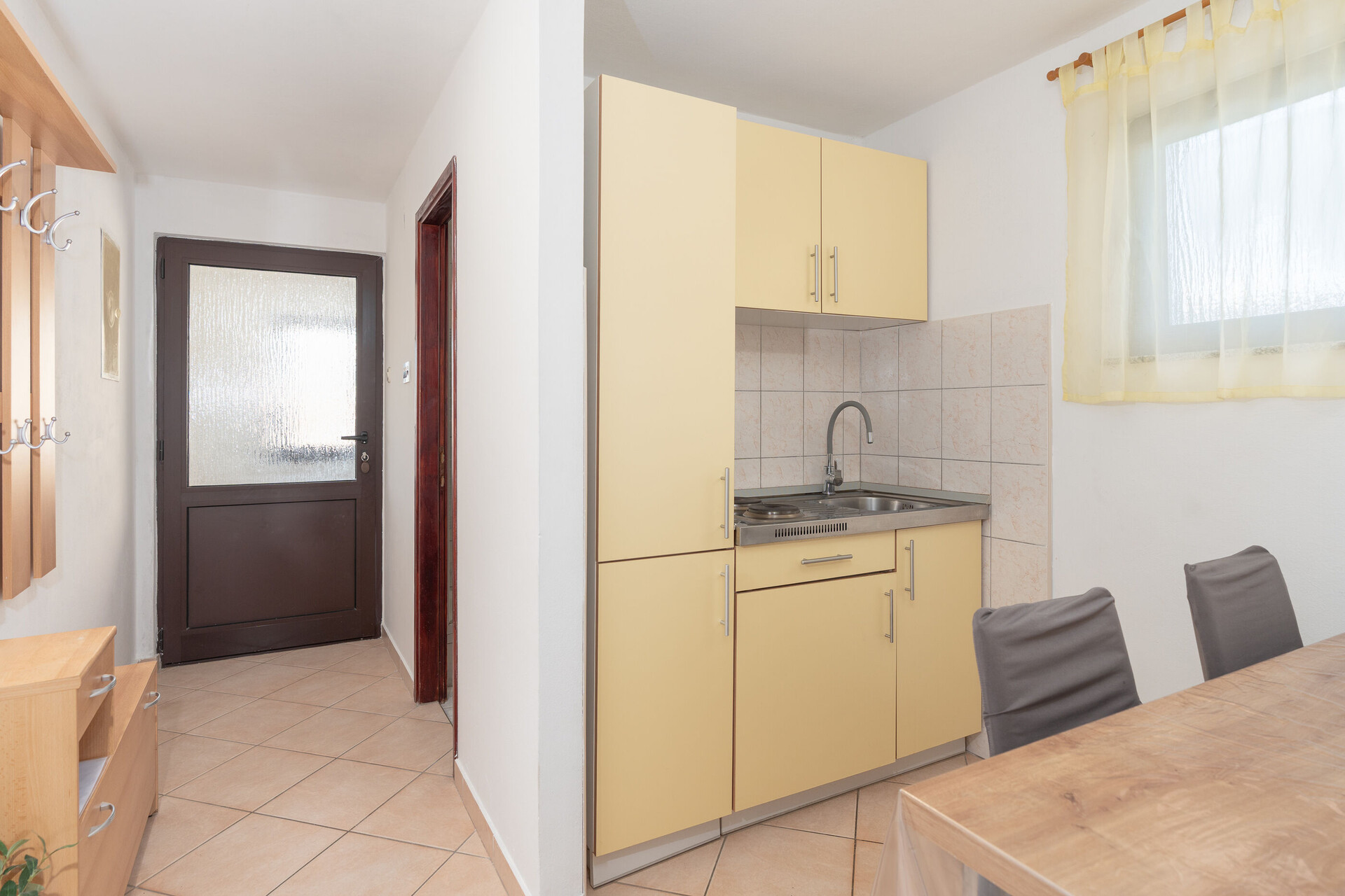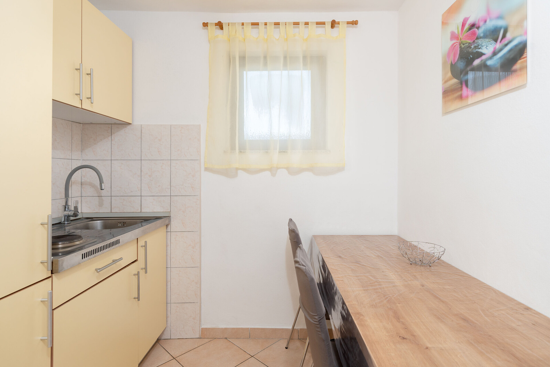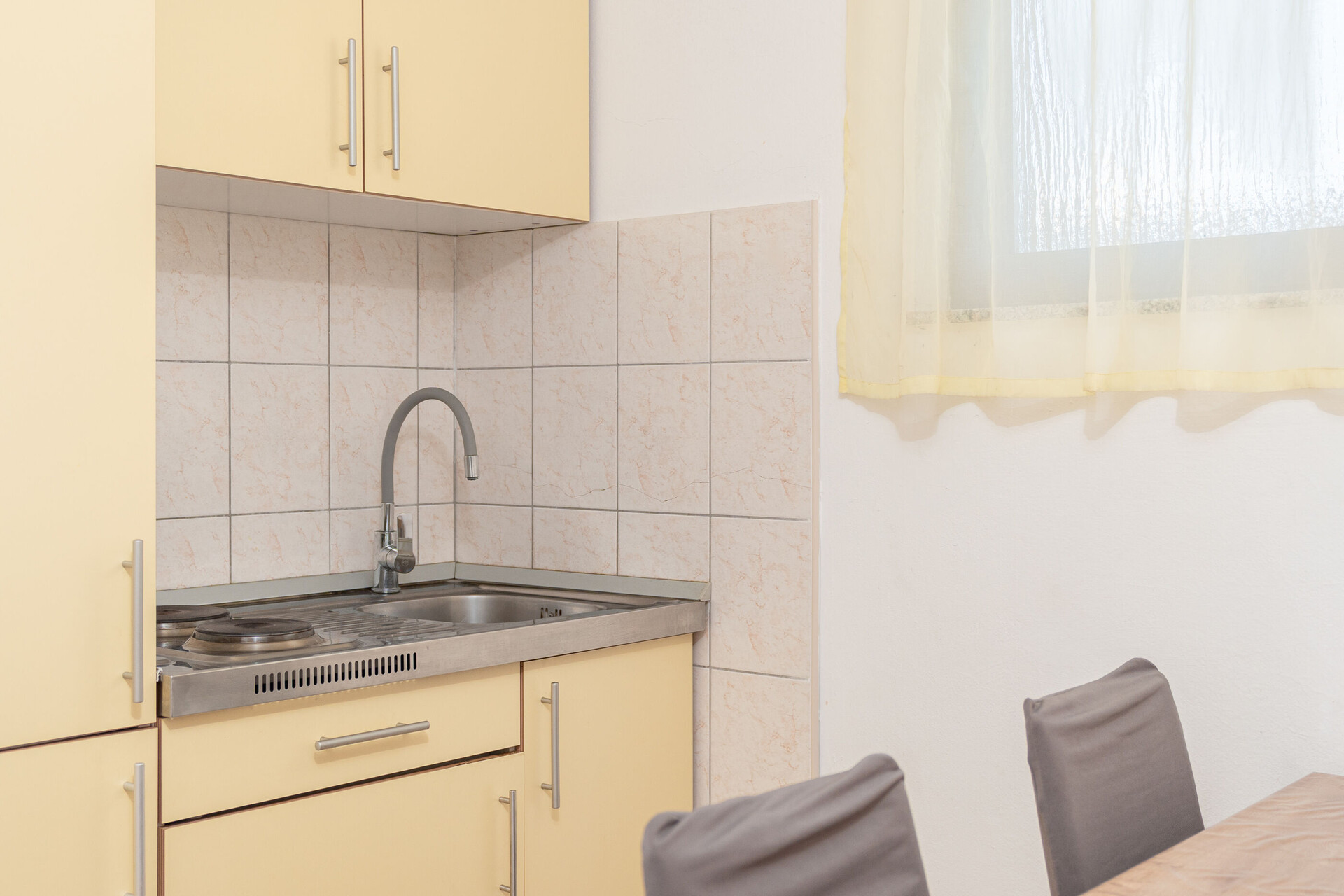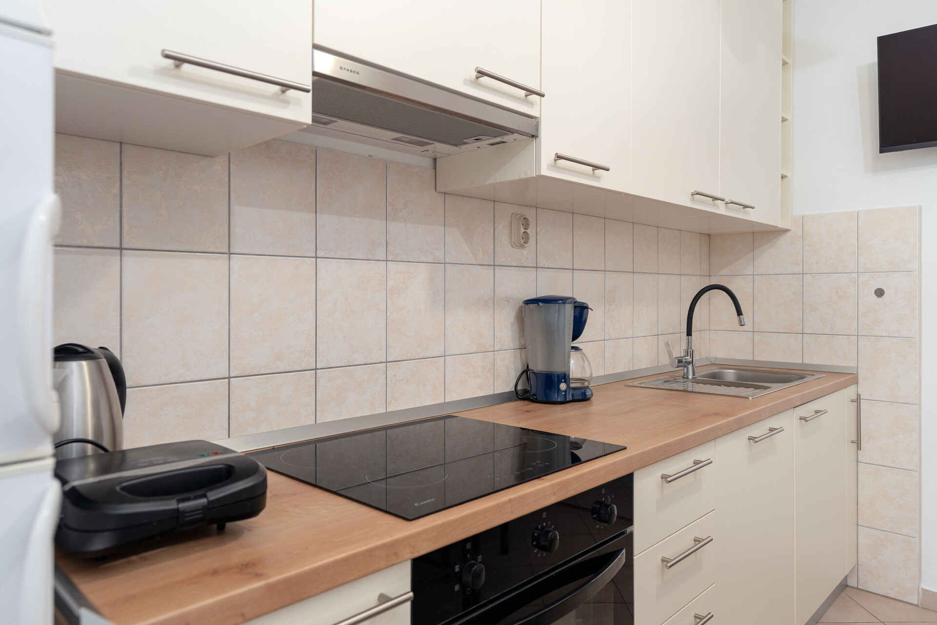• stůl a židle, dřez, lednička, kávovar, toaster, sporák varná deska.