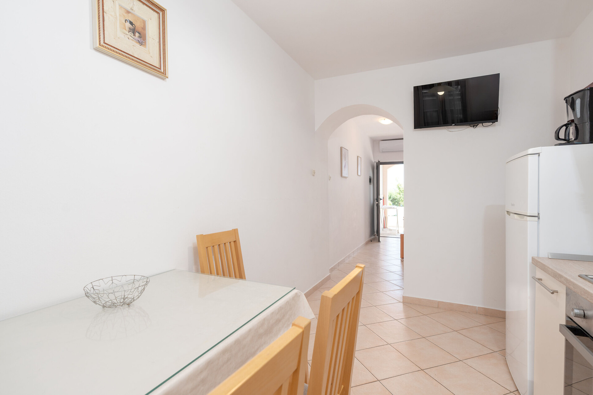 • stůl a židle, dřez, lednička, mražák, kávovar, toaster, sporák varná deska.