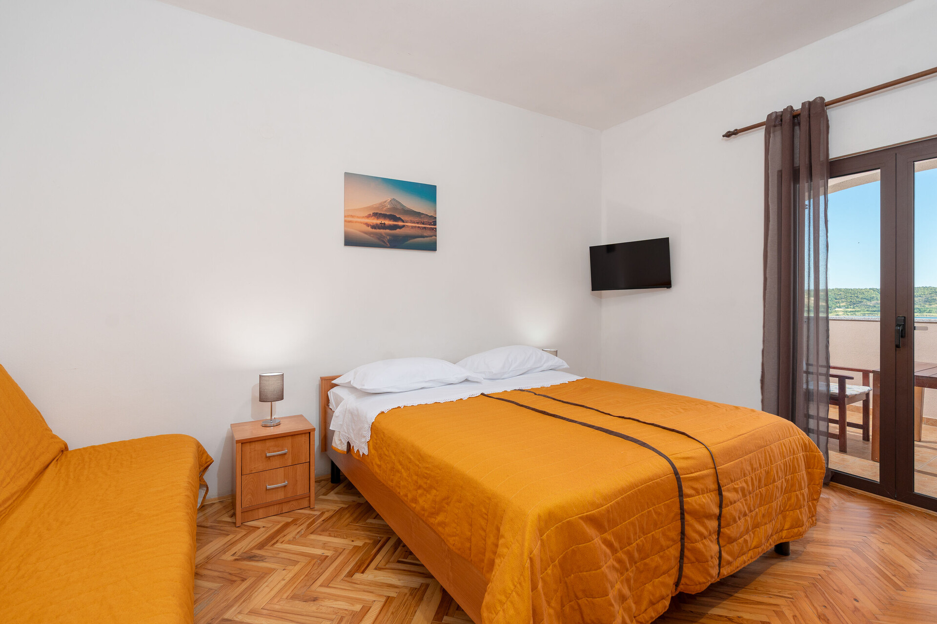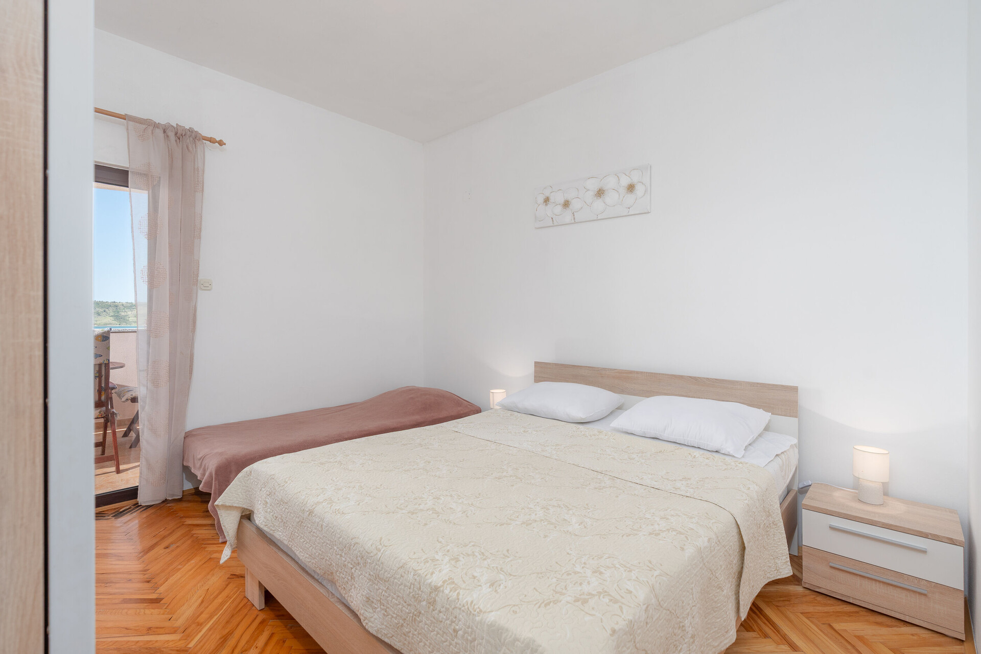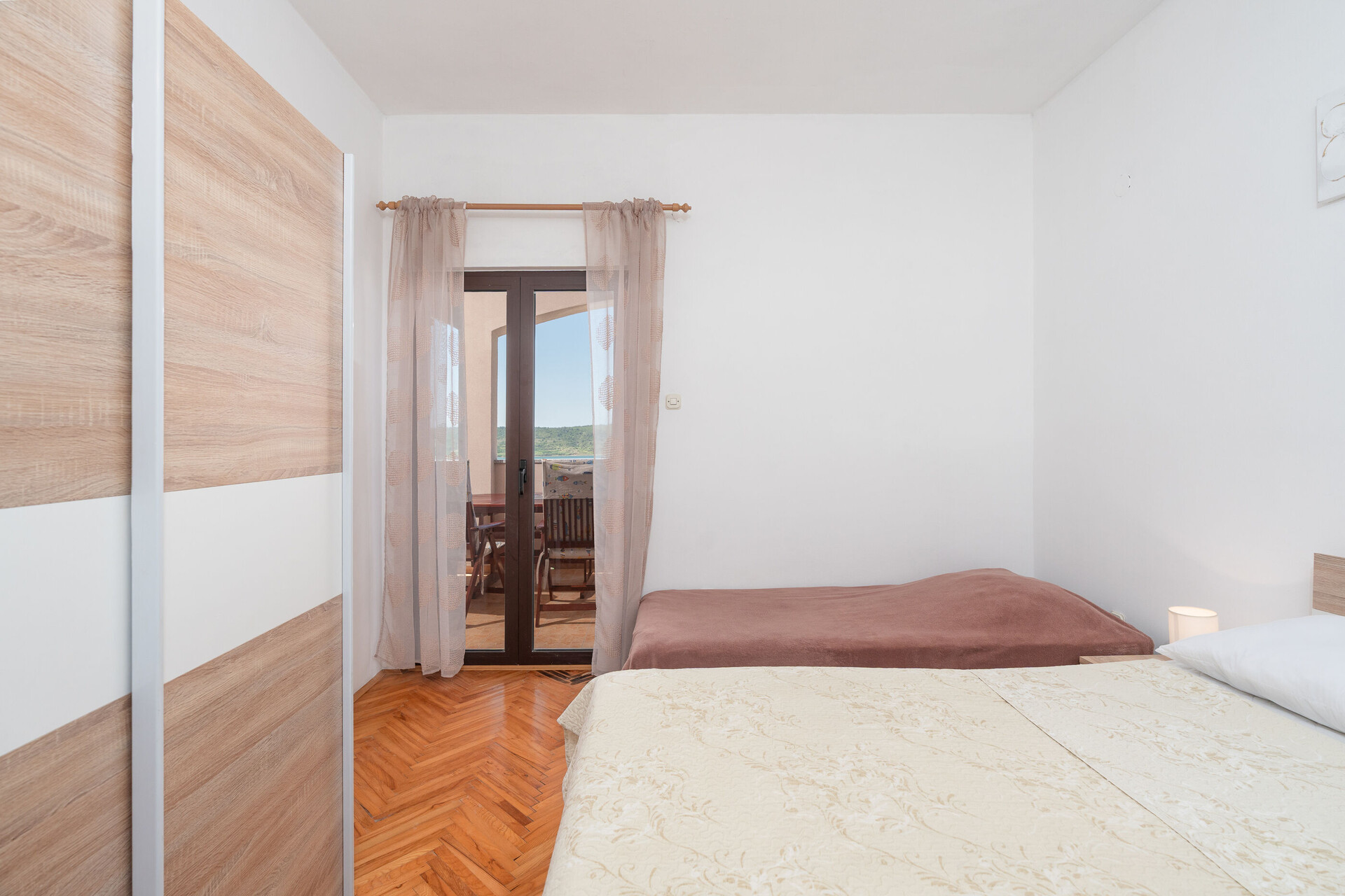• Postele: manželská postel. Pokoj má přistýlku: jedna přistýlka. Ložní prádlo je k dispozici. Z pokoje se vychází na balkon.