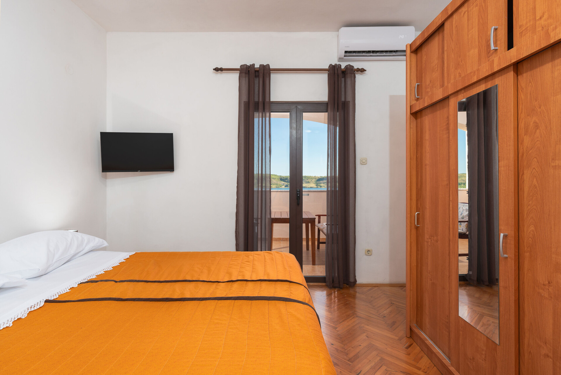 • Postele: manželská postel. Ložní prádlo je k dispozici. Z pokoje se vychází na balkon.