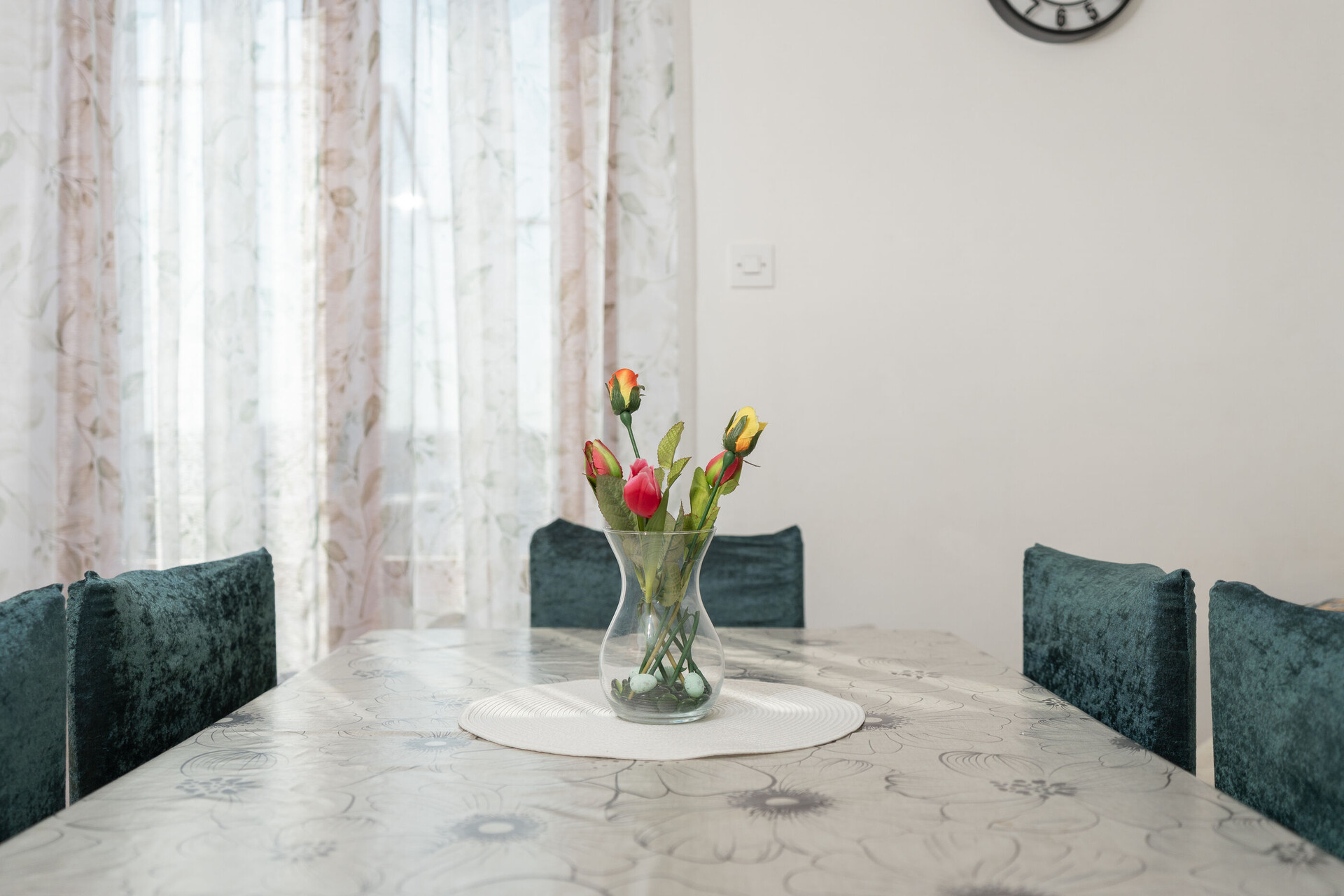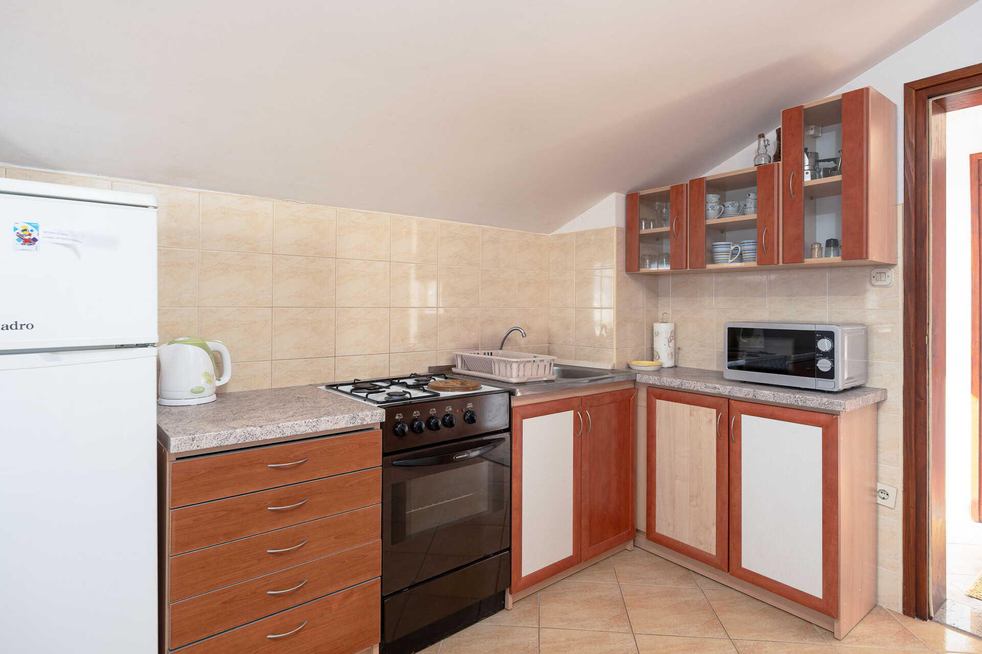 • stůl a židle, dřez, trouba, lednička, mražák, varná konvice, Mikrovlná trouba, sporák varná deska.