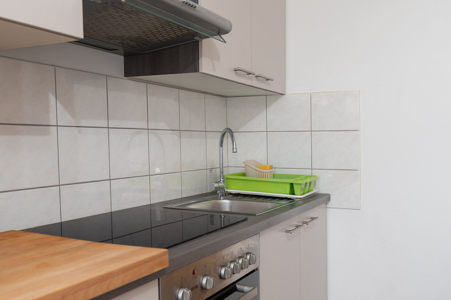 • stůl a židle, dřez, trouba, lednička, varná konvice, sporák varná deska.