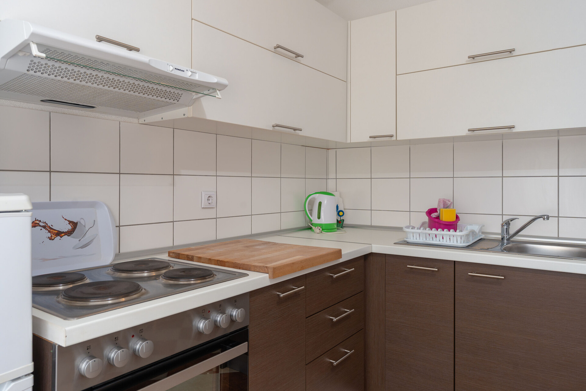 • stůl a židle, dřez, trouba, lednička, mražák, varná konvice, sporák varná deska.