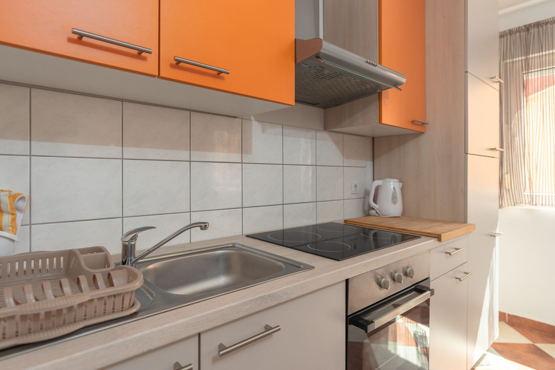• stůl a židle, dřez, trouba, lednička, mražák, toaster, sporák varná deska.