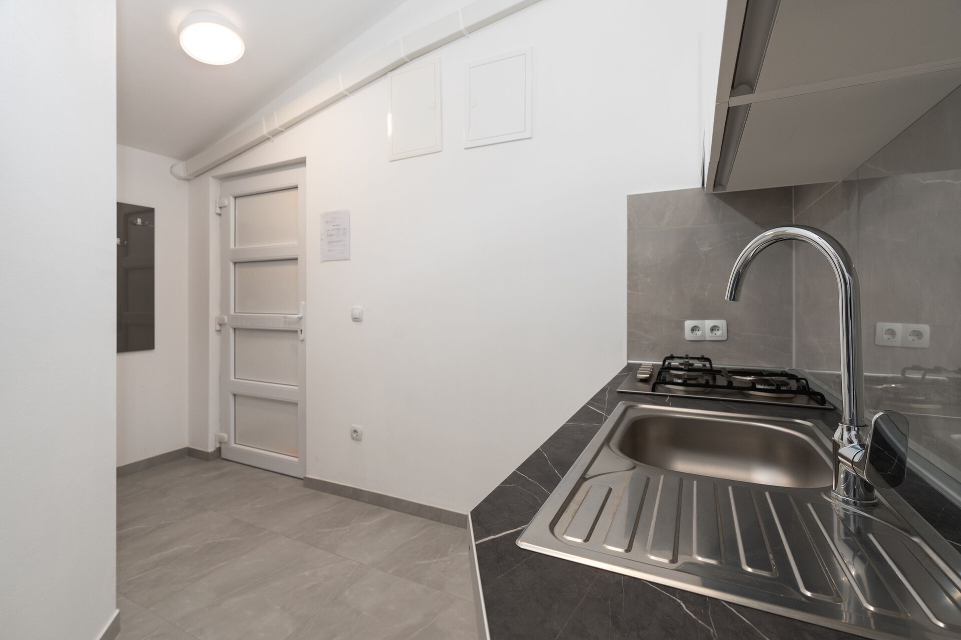 • stůl a židle, dřez, lednička, mražák, varná konvice, Mikrovlná trouba, sporák varná deska.