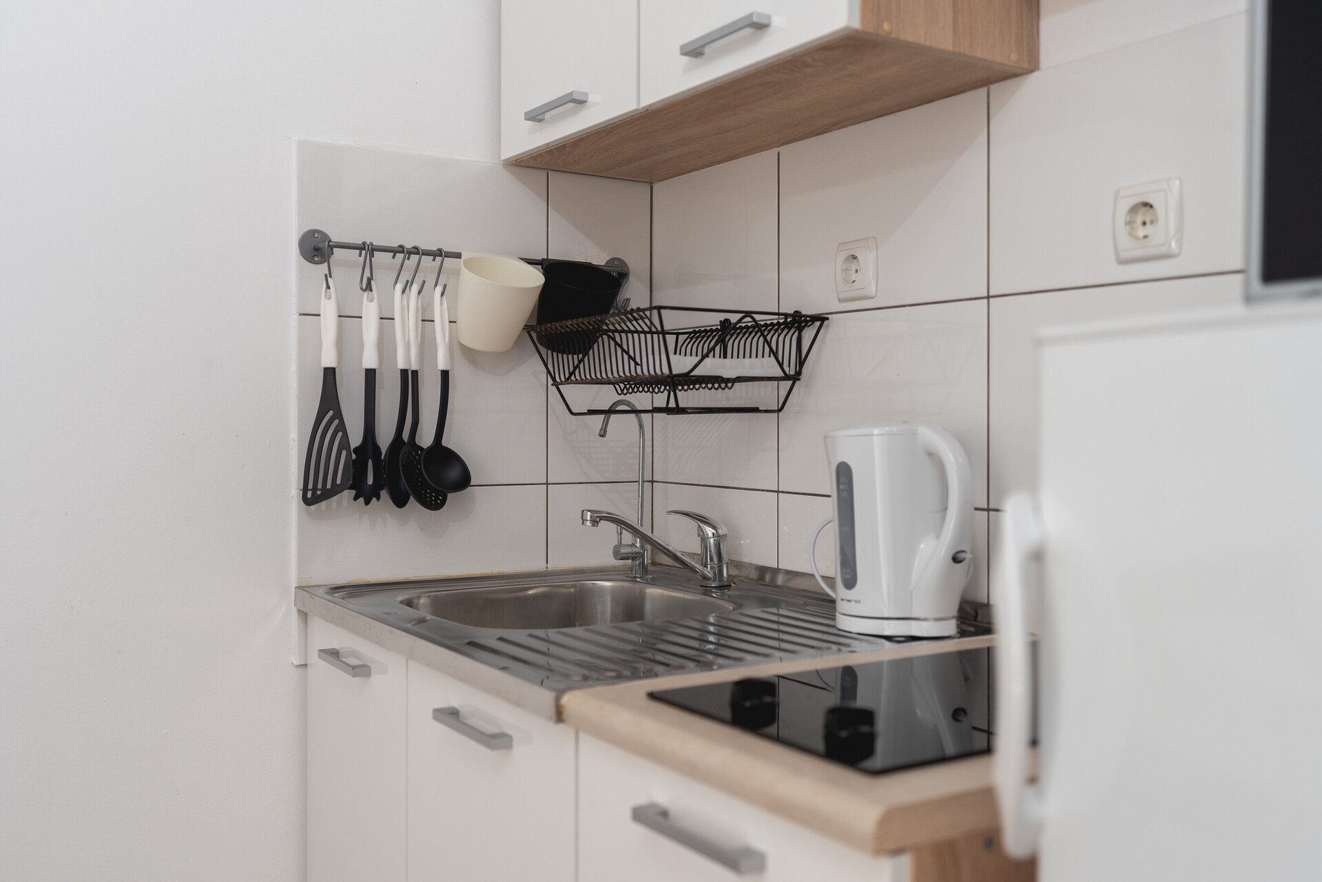• stůl a židle, dřez, trouba, lednička, mražák, varná konvice, kávovar, Mikrovlná trouba, toaster, sporák varná deska.