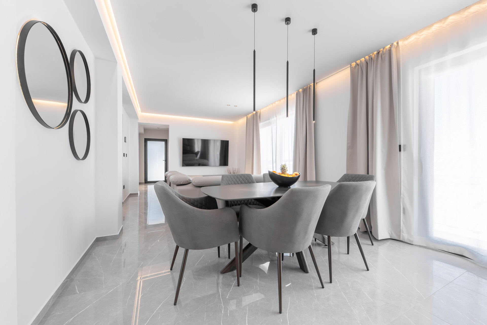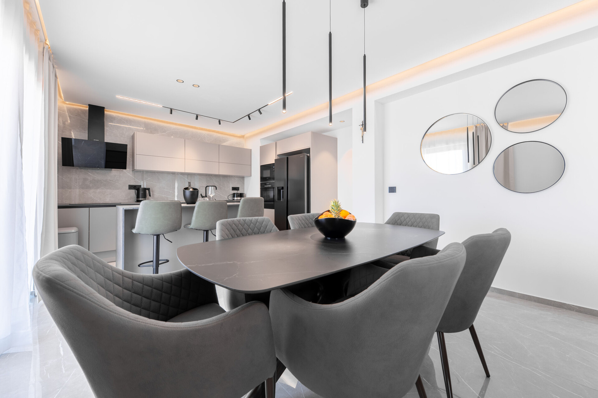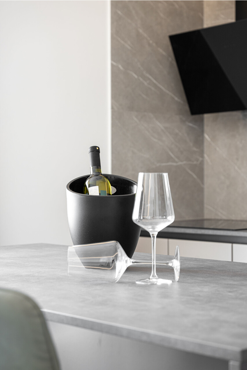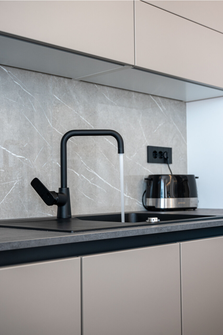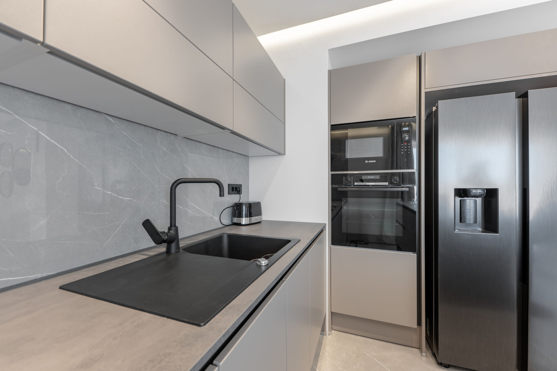 • stůl a židle, dřez, trouba, lednička, mražák, varná konvice, kávovar, Mikrovlná trouba, toaster, myčka na nádobí, žehlička, sporák varná deska.