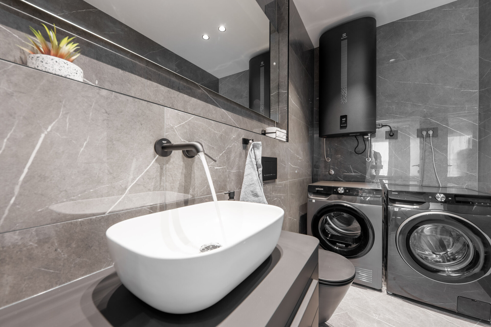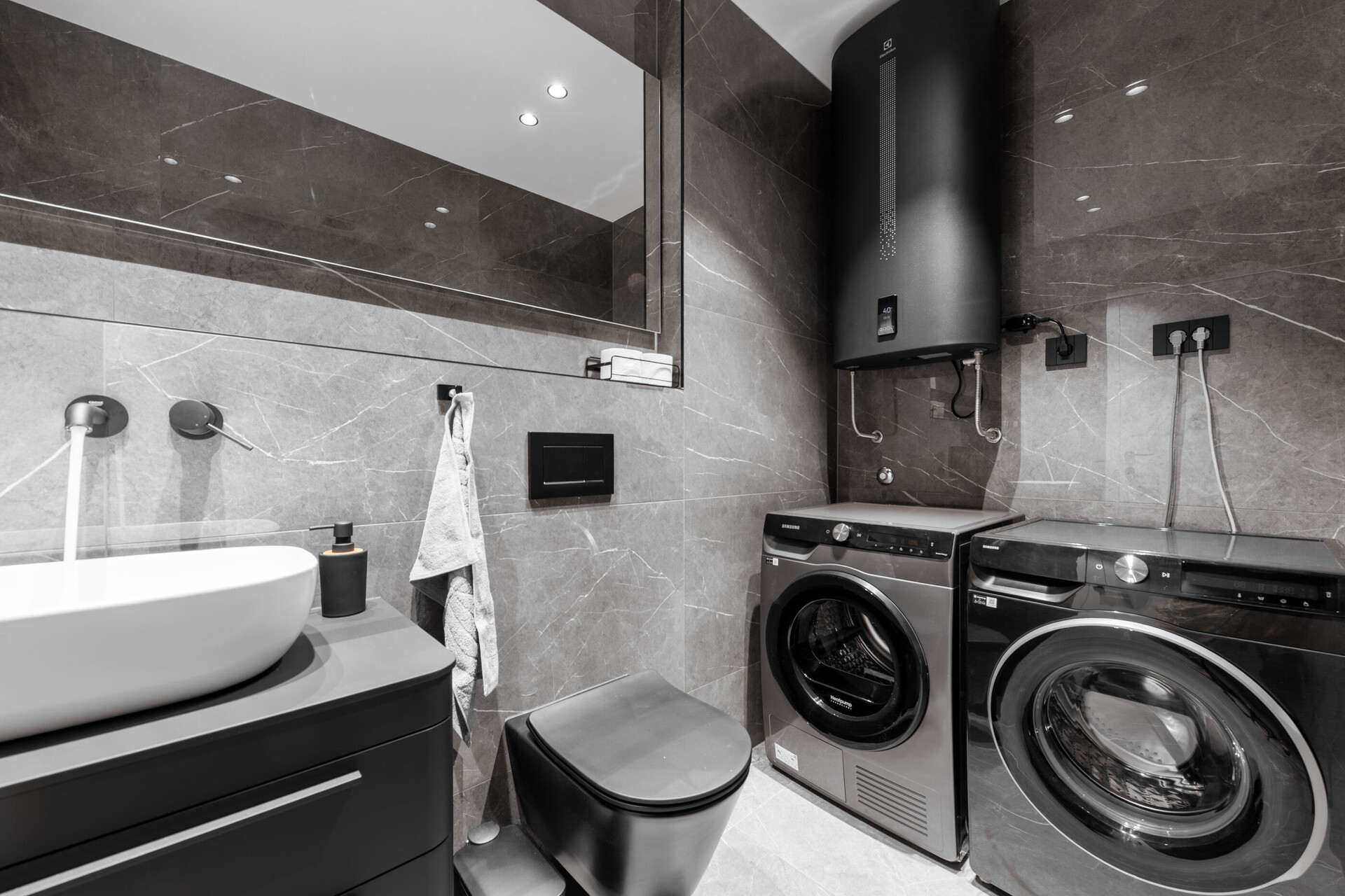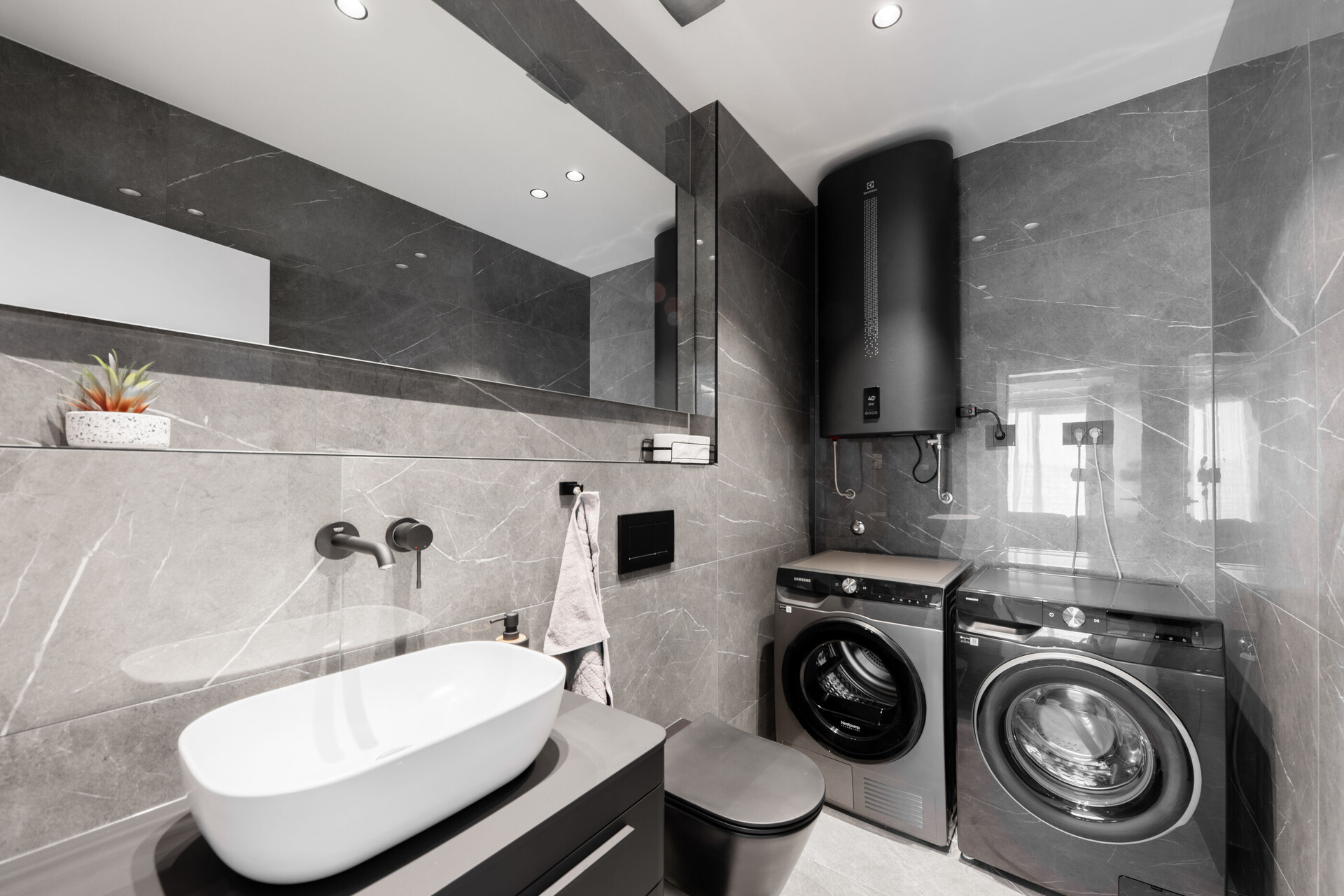 • sprcha, sprchový kout, pračka, fén, ručníky.