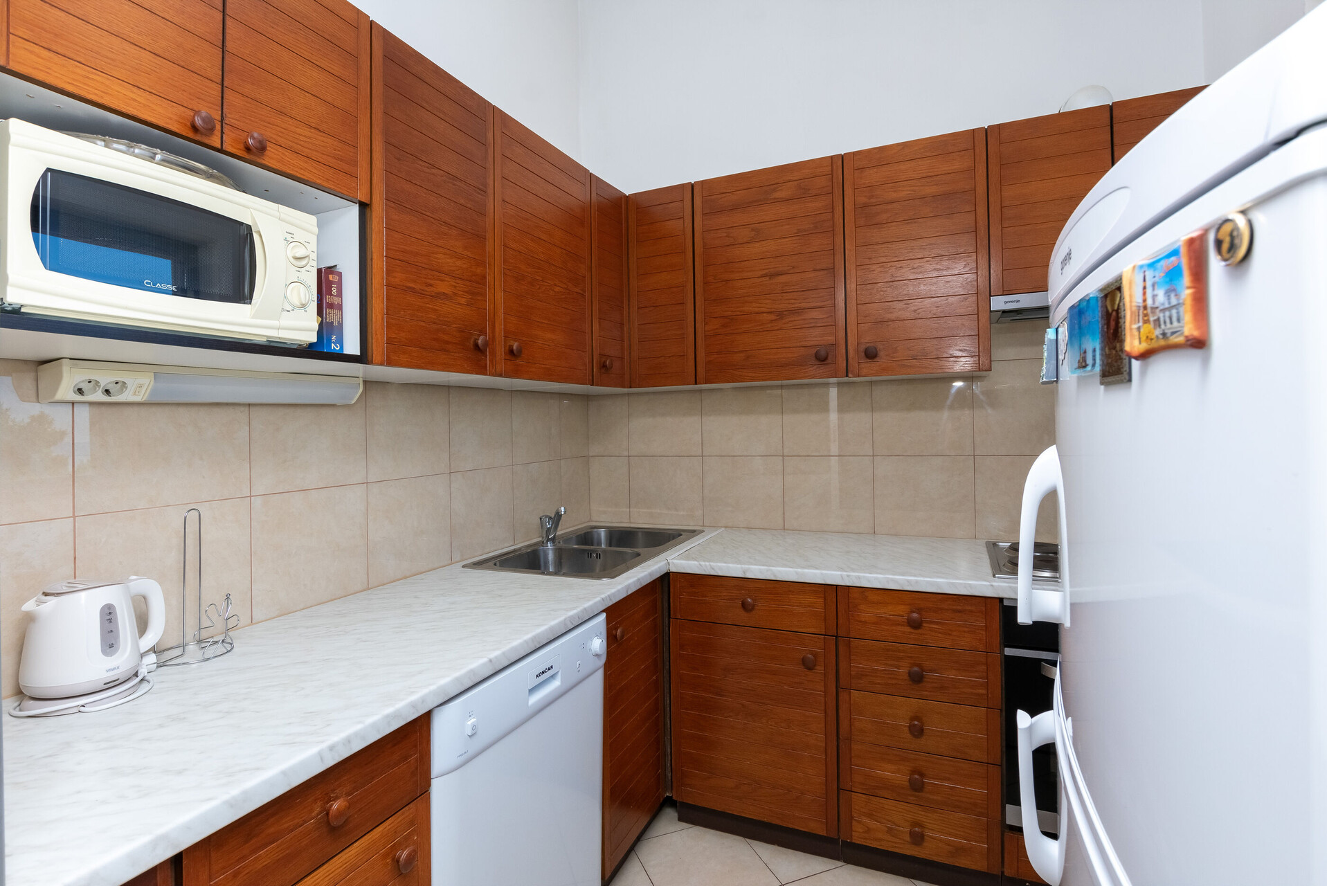 • stůl a židle, dřez, trouba, lednička, mražák, kávovar, Mikrovlná trouba, žehlička, sporák varná deska.