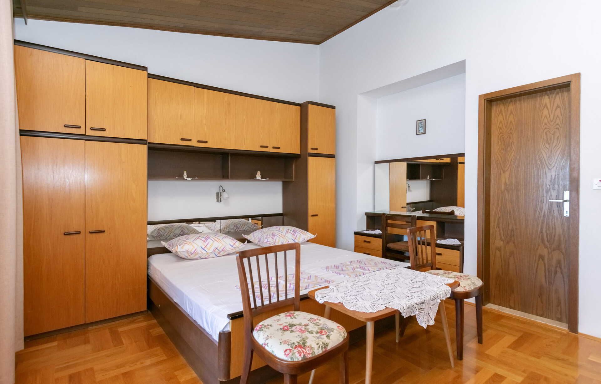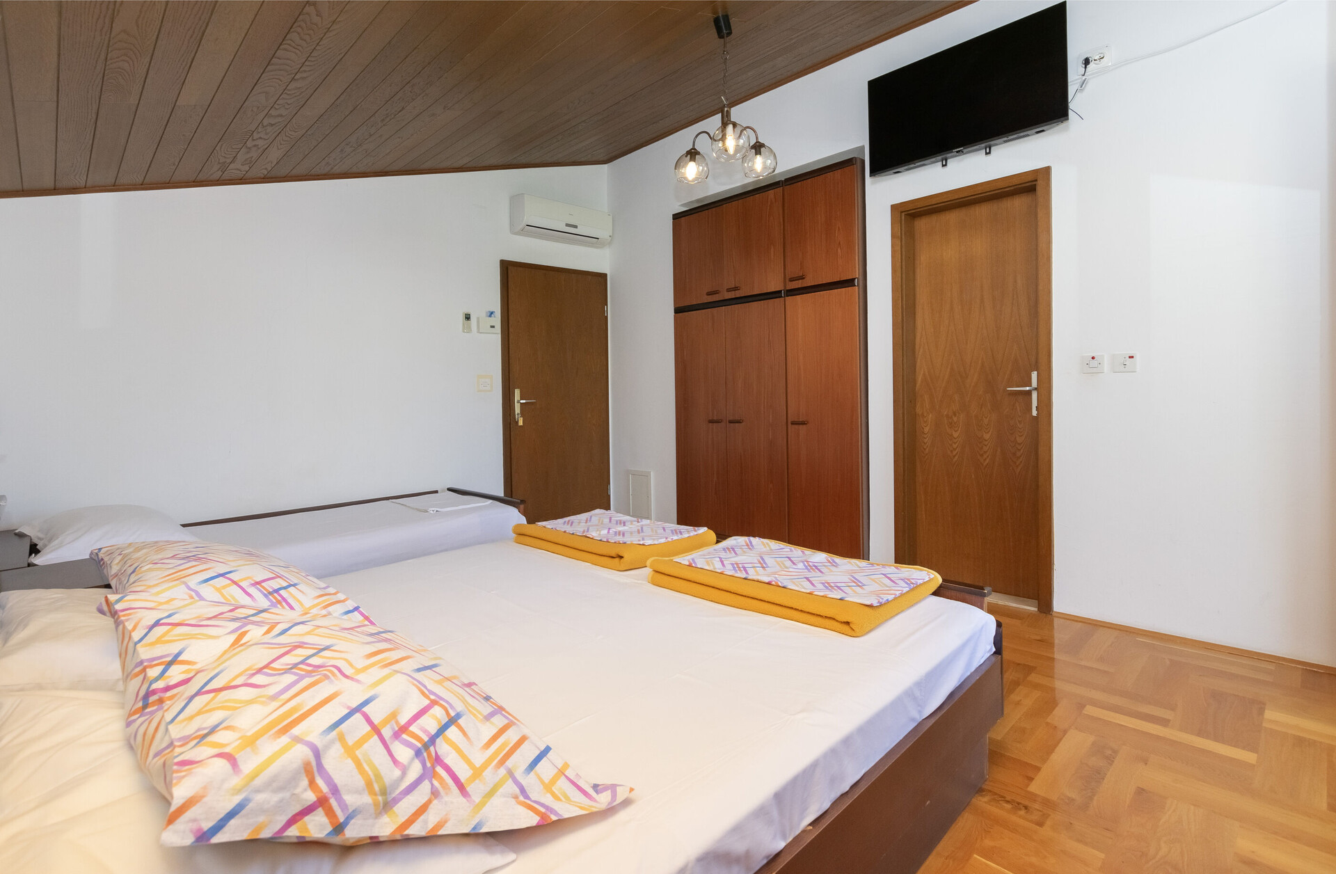 • Postele: manželská postel, Postel pro jednu osobu. Ložní prádlo je k dispozici. Z pokoje se vychází na balkon.