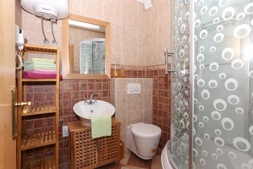 • sprcha, sprchový kout, pračka, fén, ručníky.
