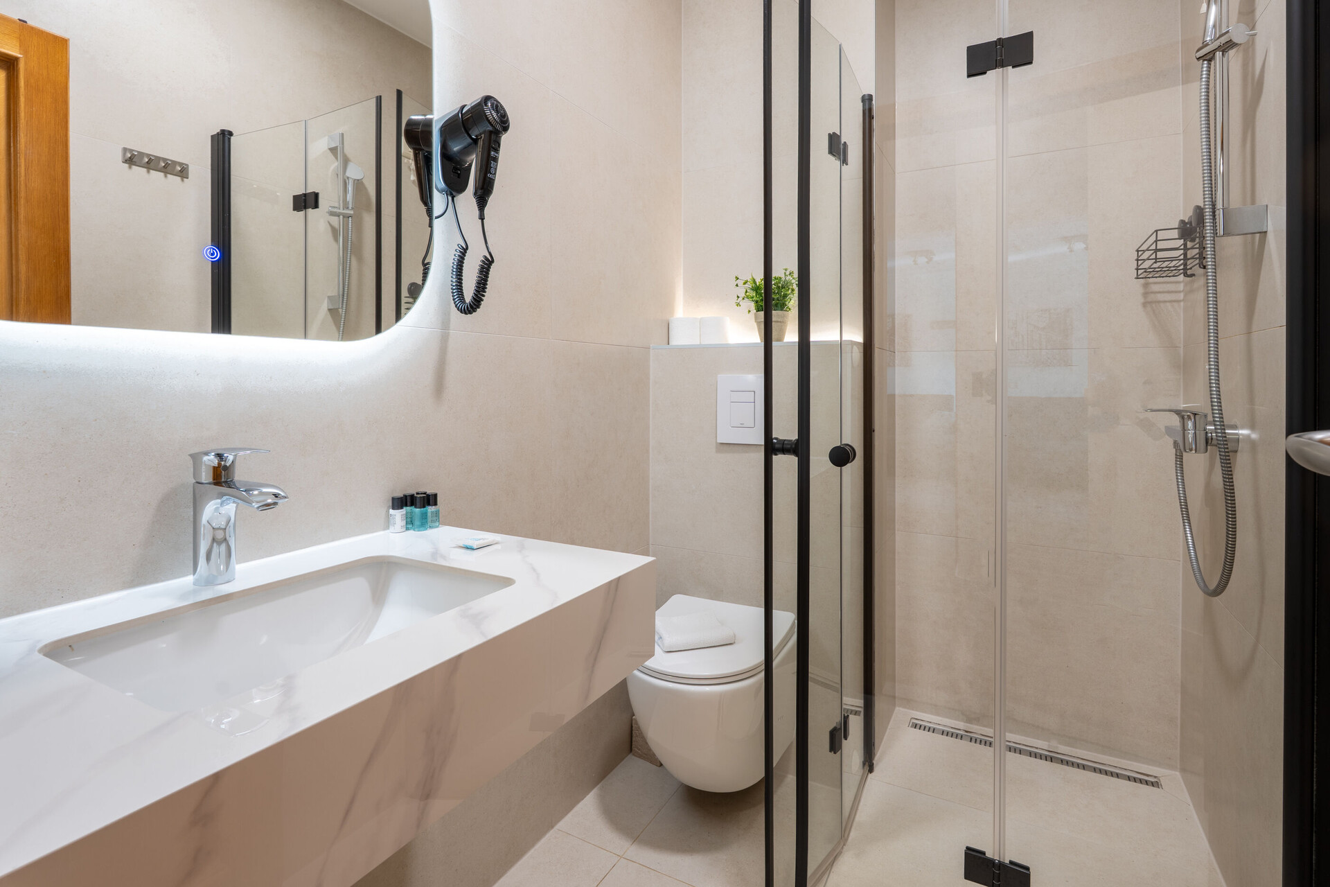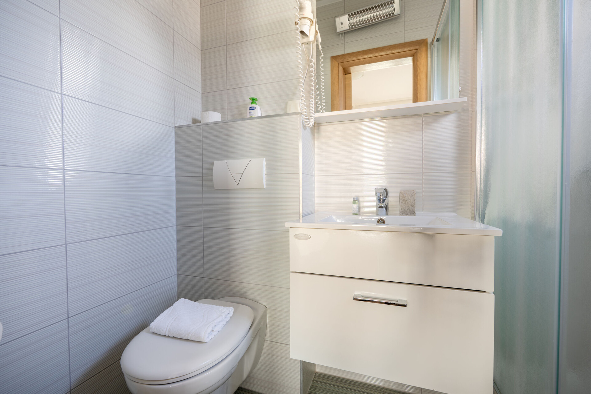 • sprcha, sprchový kout, pračka, fén, ručníky.