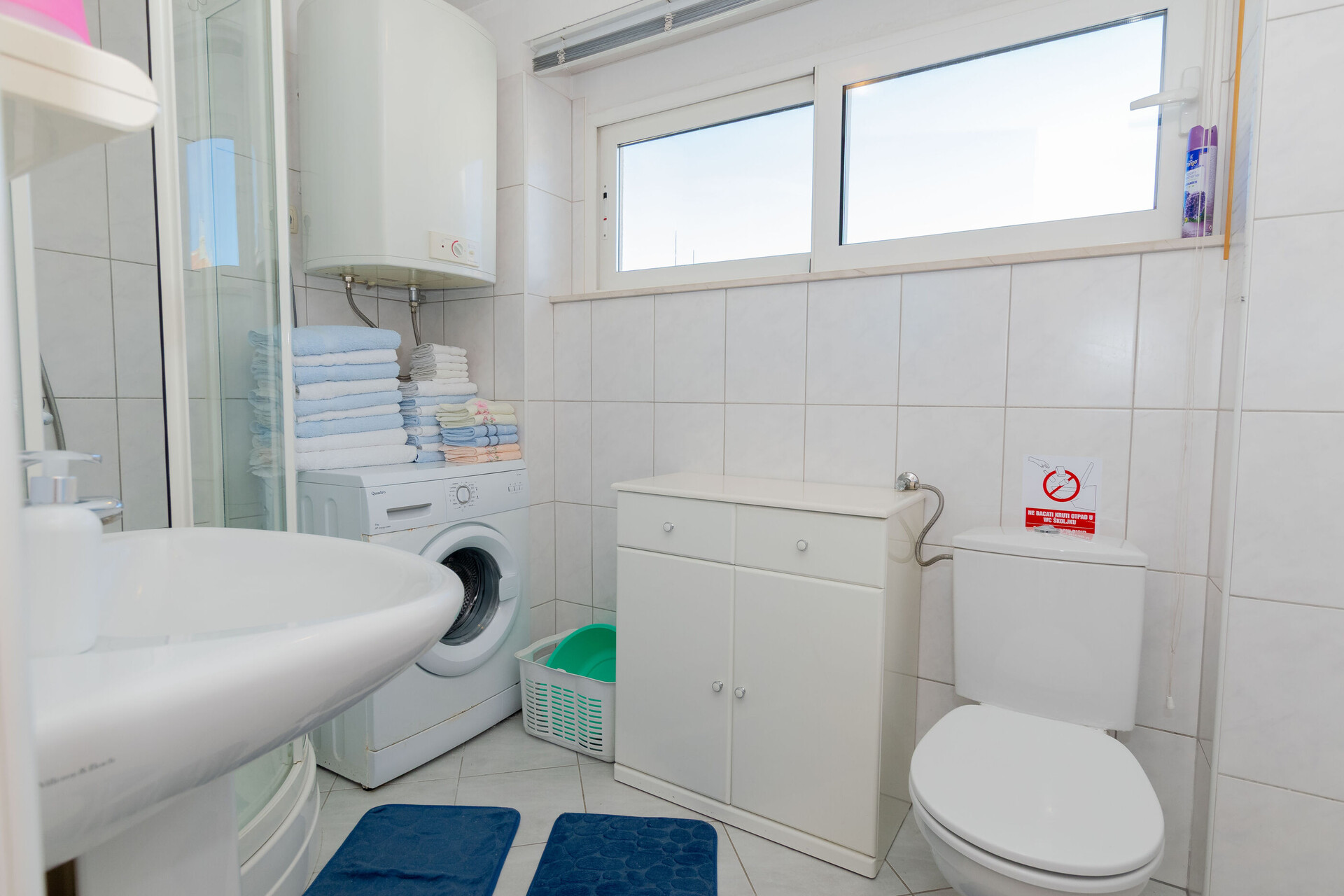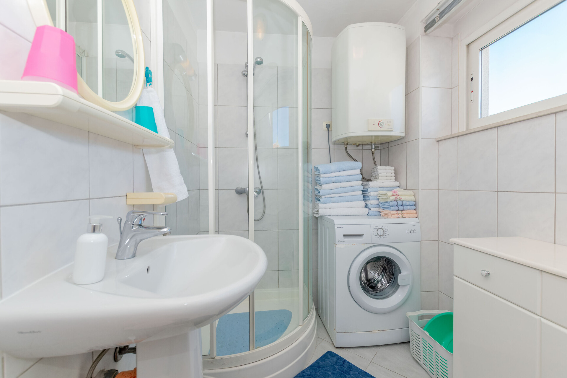 • sprcha, sprchový kout, pračka, fén, ručníky.