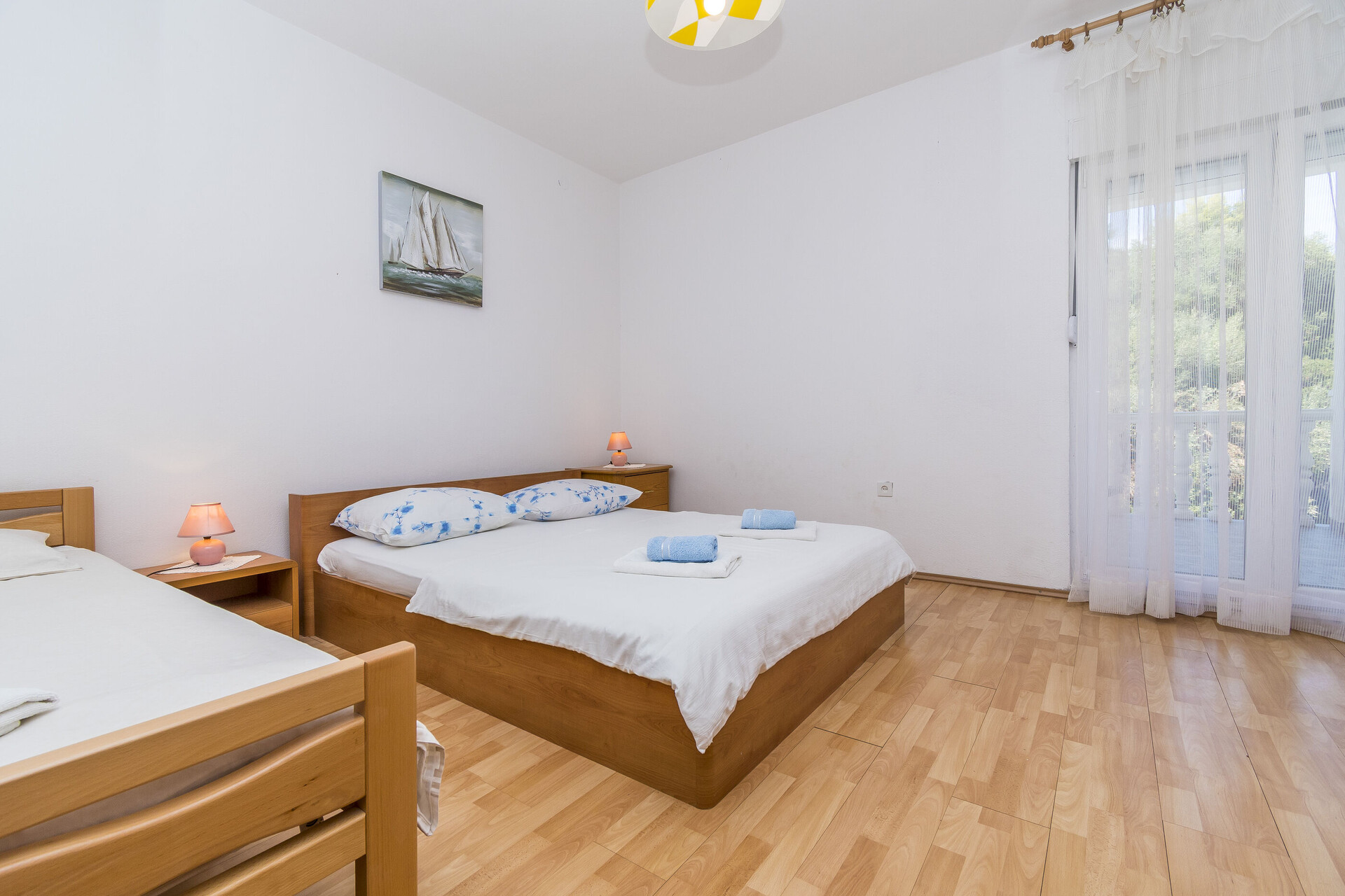 • Postele: manželská postel, Postel pro jednu osobu. Ložní prádlo je k dispozici. Z pokoje se vychází na balkon.