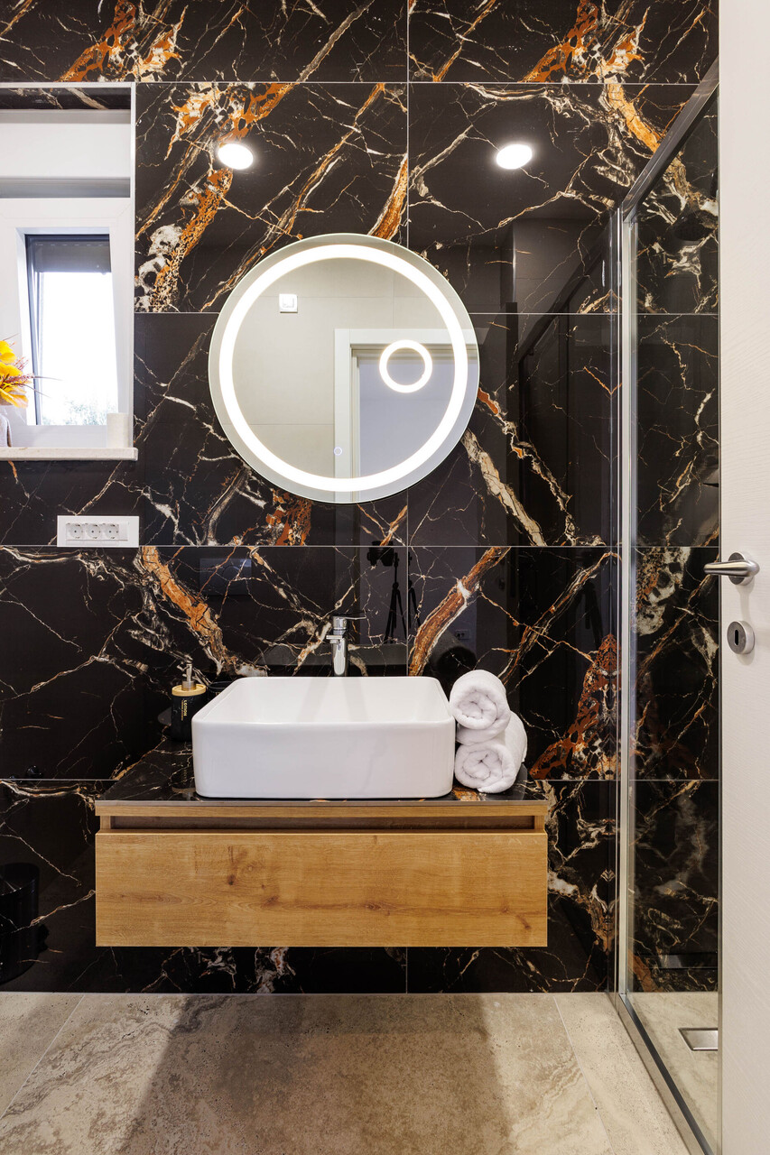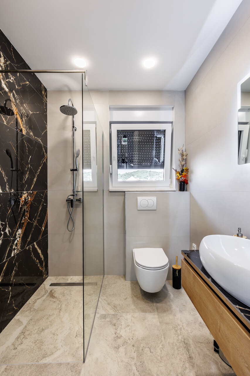 • sprcha, sprchový kout, pračka, fén, ručníky.