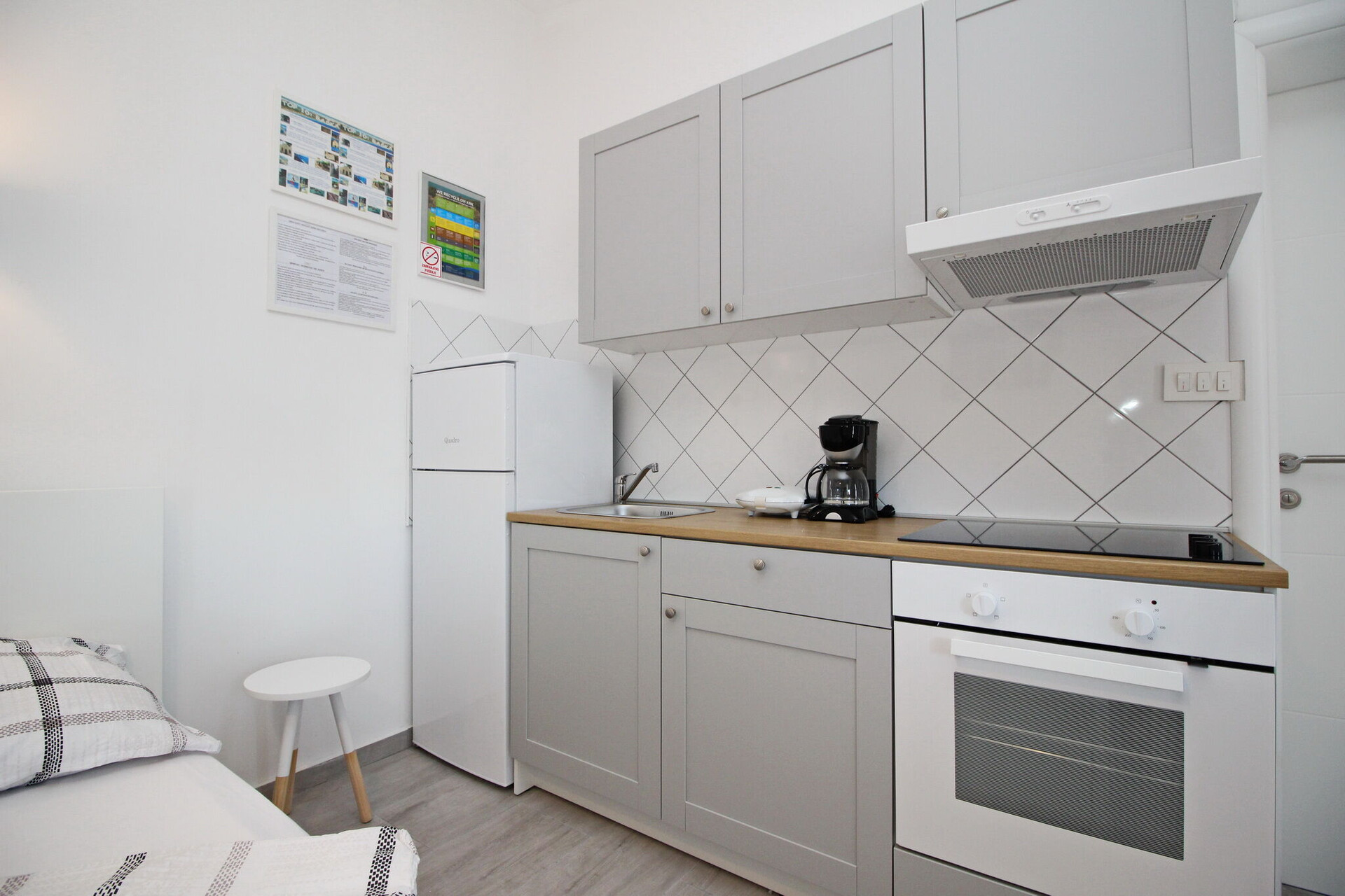 • Tisch und Stühle, Waschbecken, Ofen, Kühlschrank, Kühlfach, Wasserkocher, Filterkaffee-Aparat, Herd Kochfeld.