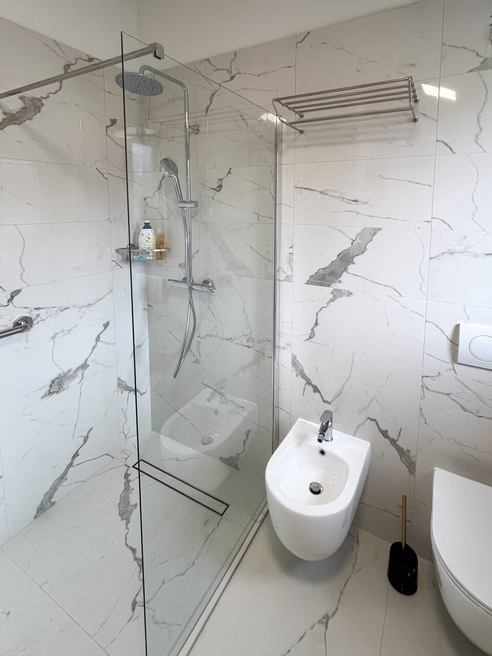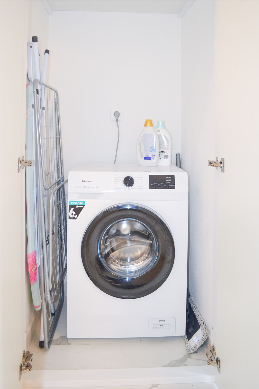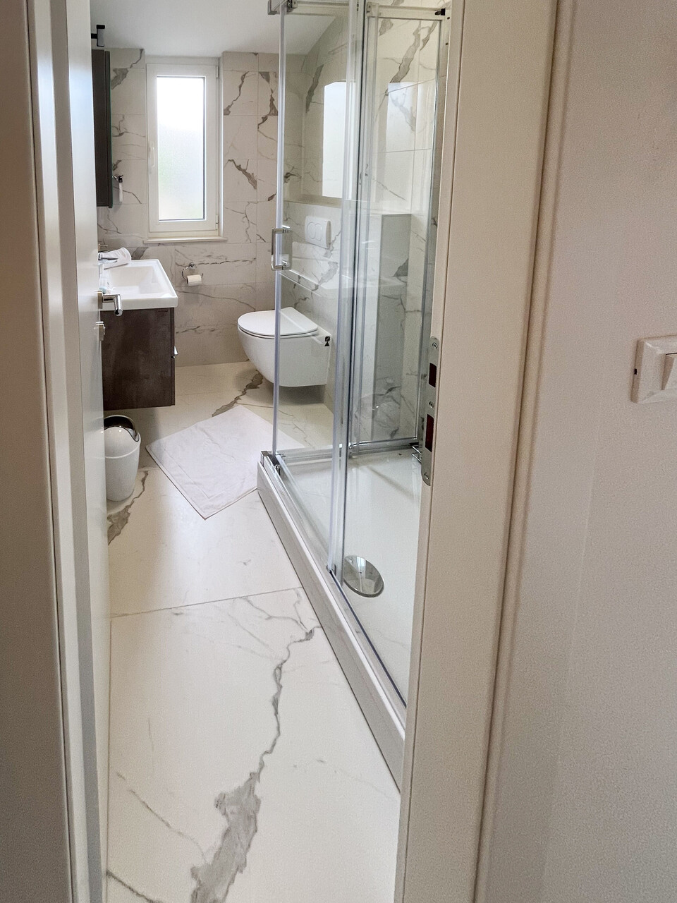 • Dusche, Duschkabine, Waschmaschine, Handtücher.