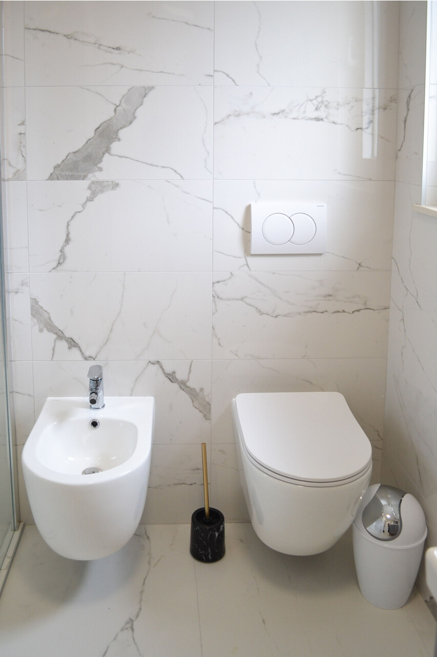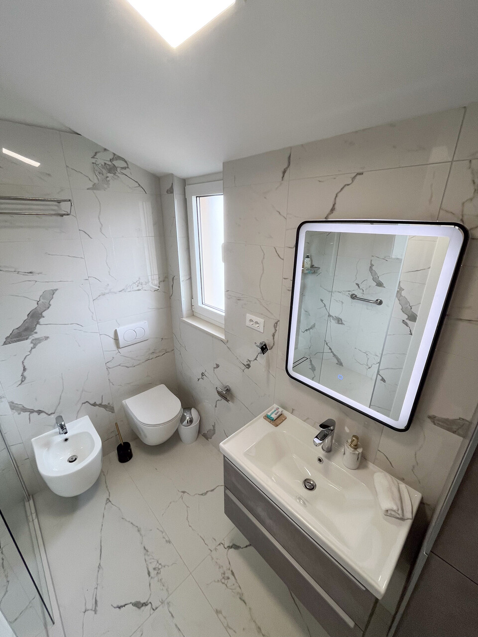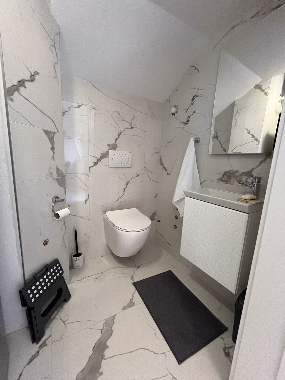 • Dusche, Duschkabine, Waschmaschine, Handtücher.