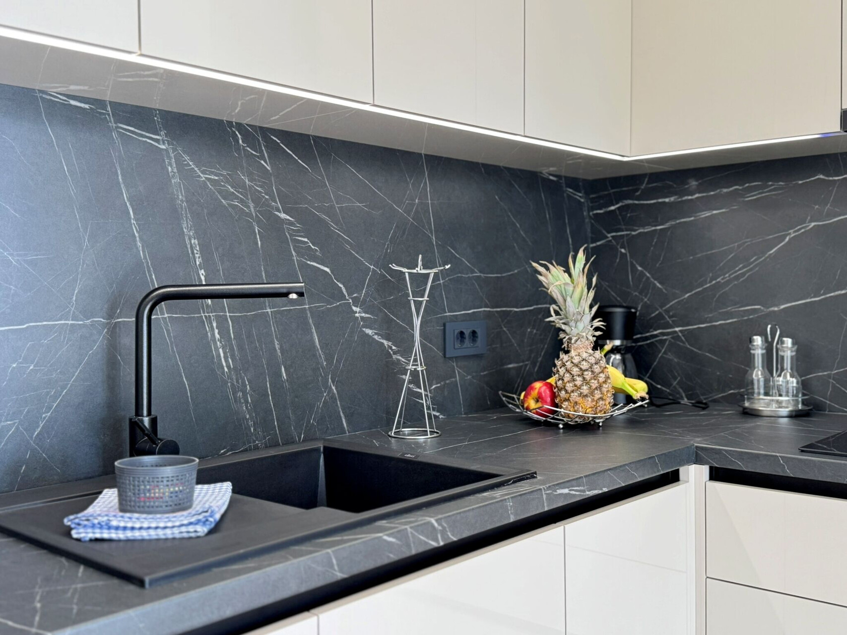 • Tisch und Stühle, Waschbecken, Kühlschrank, Kühlfach, Wasserkocher, Filterkaffee-Aparat, Mikrowelle, Geschirrspülmaschine, Herd Kochfeld.