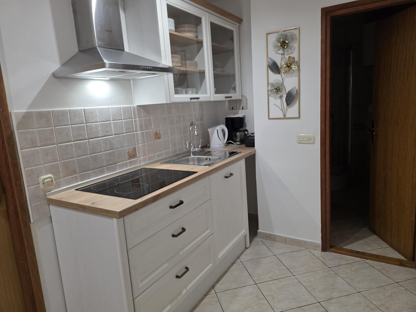 • Tisch und Stühle, Waschbecken, Kühlschrank, Filterkaffee-Aparat, Herd Kochfeld.