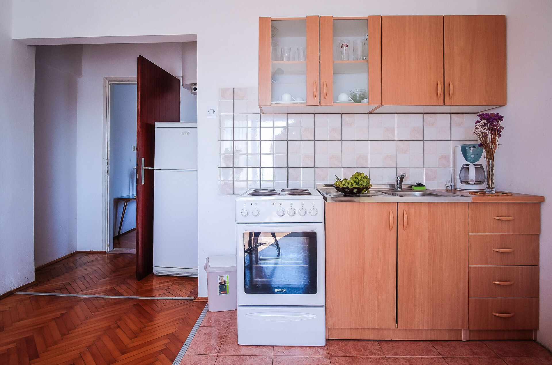 • Tisch und Stühle, Waschbecken, Ofen, Kühlschrank, Kühlfach, Filterkaffee-Aparat, Bügeleisen, Herd Kochfeld.