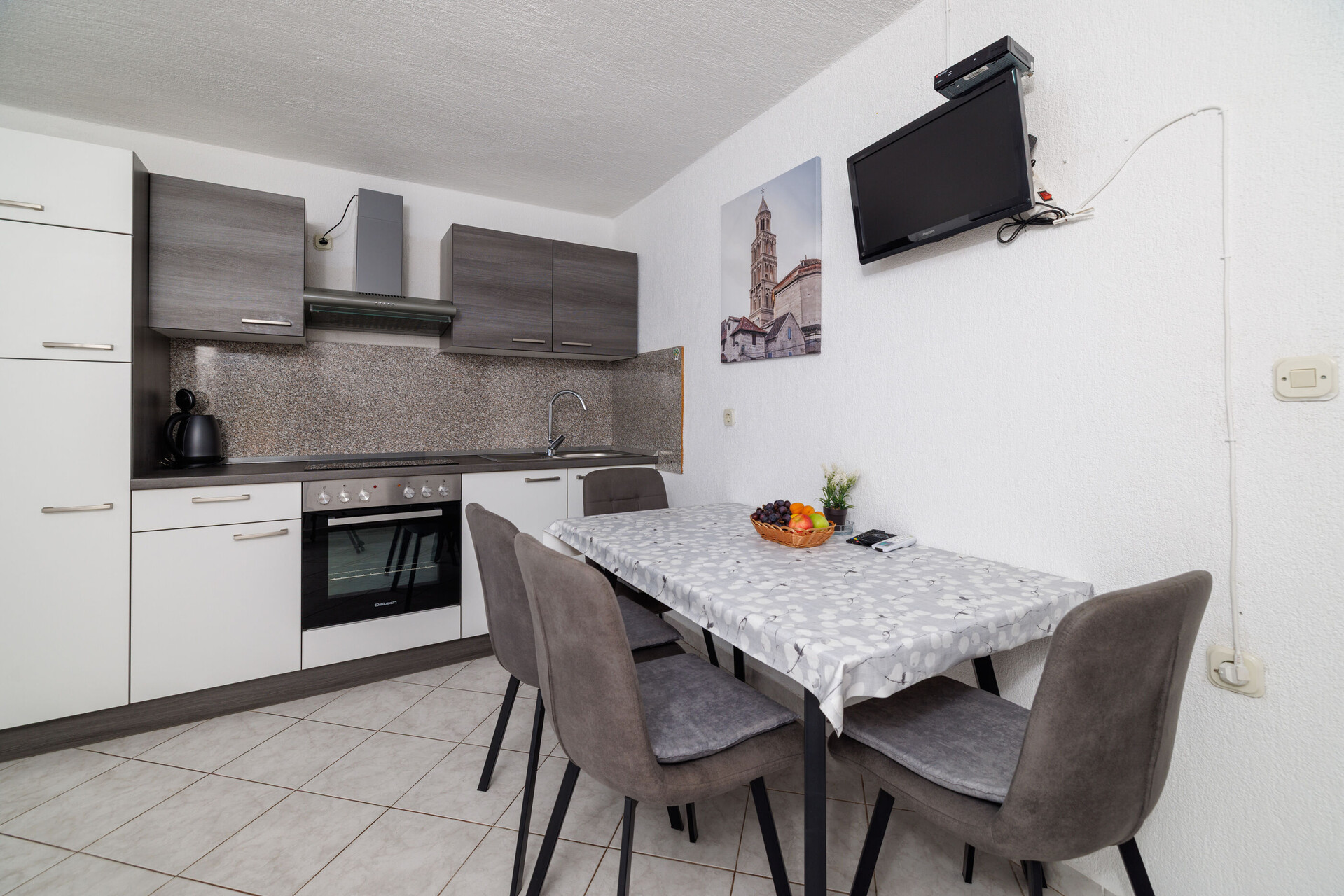 • Tisch und Stühle, Waschbecken, Ofen, Kühlschrank, Kühlfach, Wasserkocher, Mikrowelle, Herd Kochfeld.