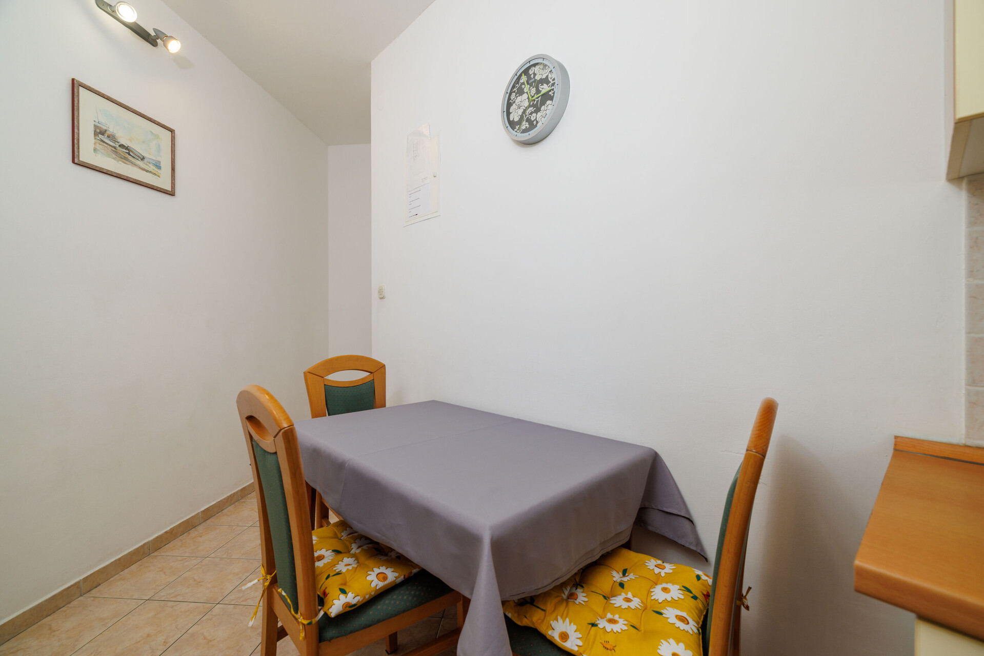 • Tisch und Stühle, Waschbecken, Kühlschrank, Kühlfach, Filterkaffee-Aparat, Herd Kochfeld.