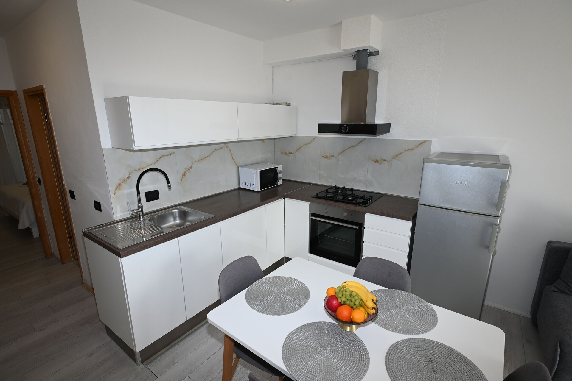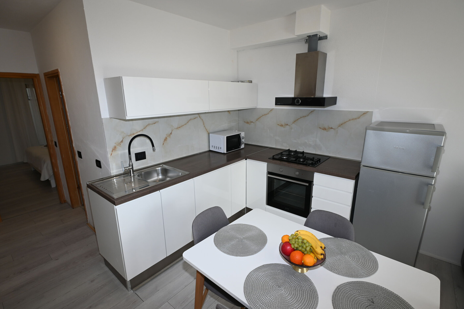 • Tisch und Stühle, Waschbecken, Ofen, Kühlschrank, Kühlfach, Wasserkocher, Filterkaffee-Aparat, Mikrowelle, Toaster, Geschirrspülmaschine, Bügeleisen, Herd Kochfeld.
