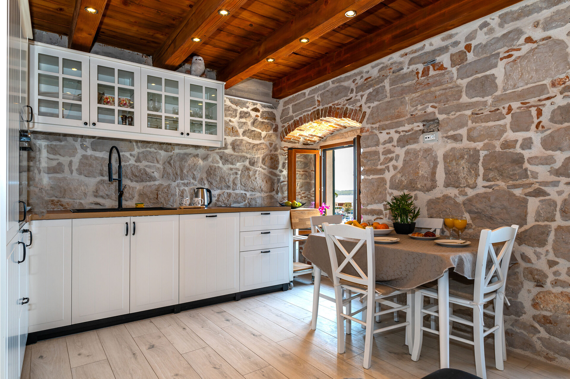 • Tisch und Stühle, Waschbecken, Ofen, Kühlschrank, Wasserkocher, Geschirrspülmaschine, Bügeleisen, Herd Kochfeld.