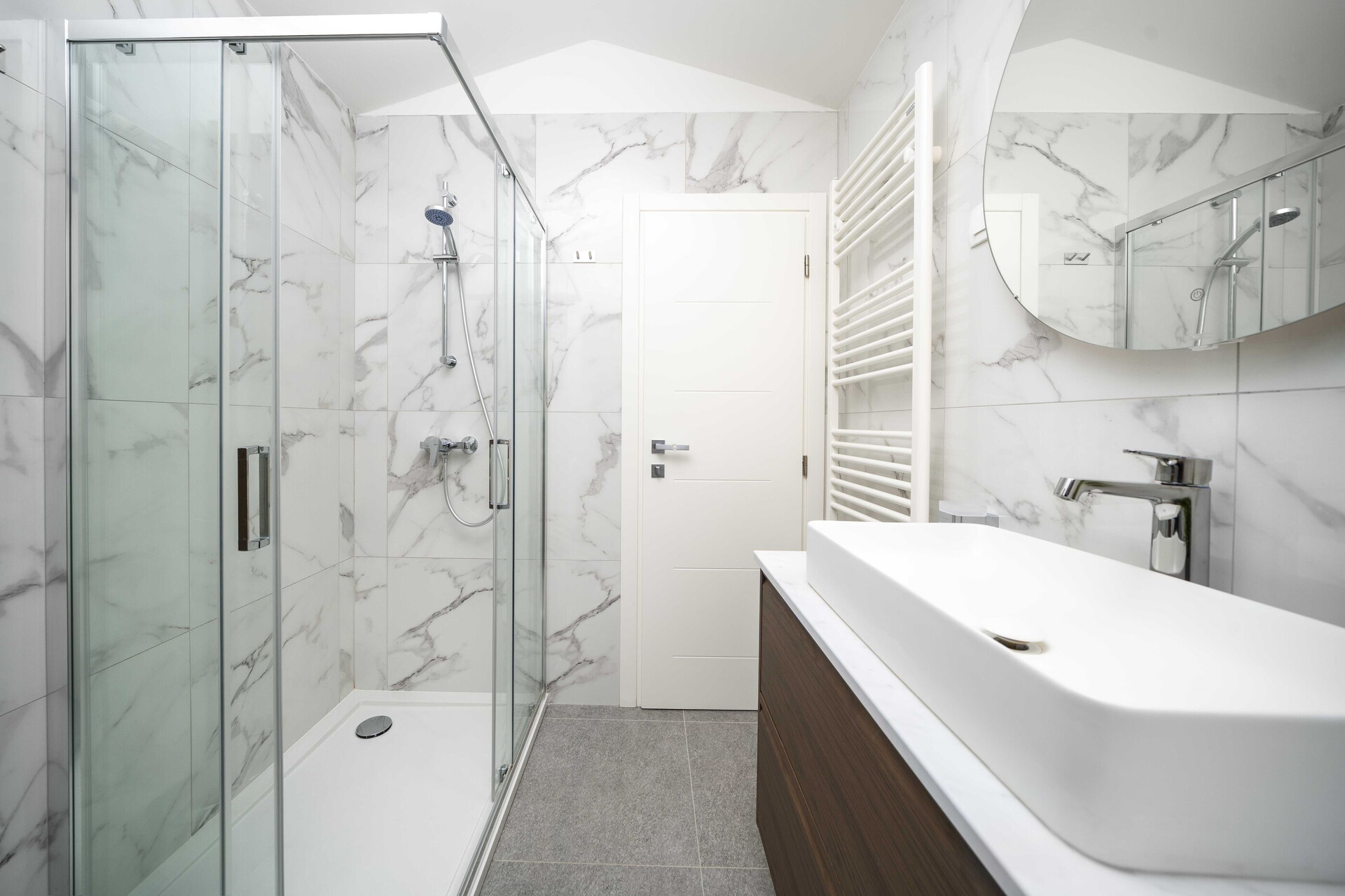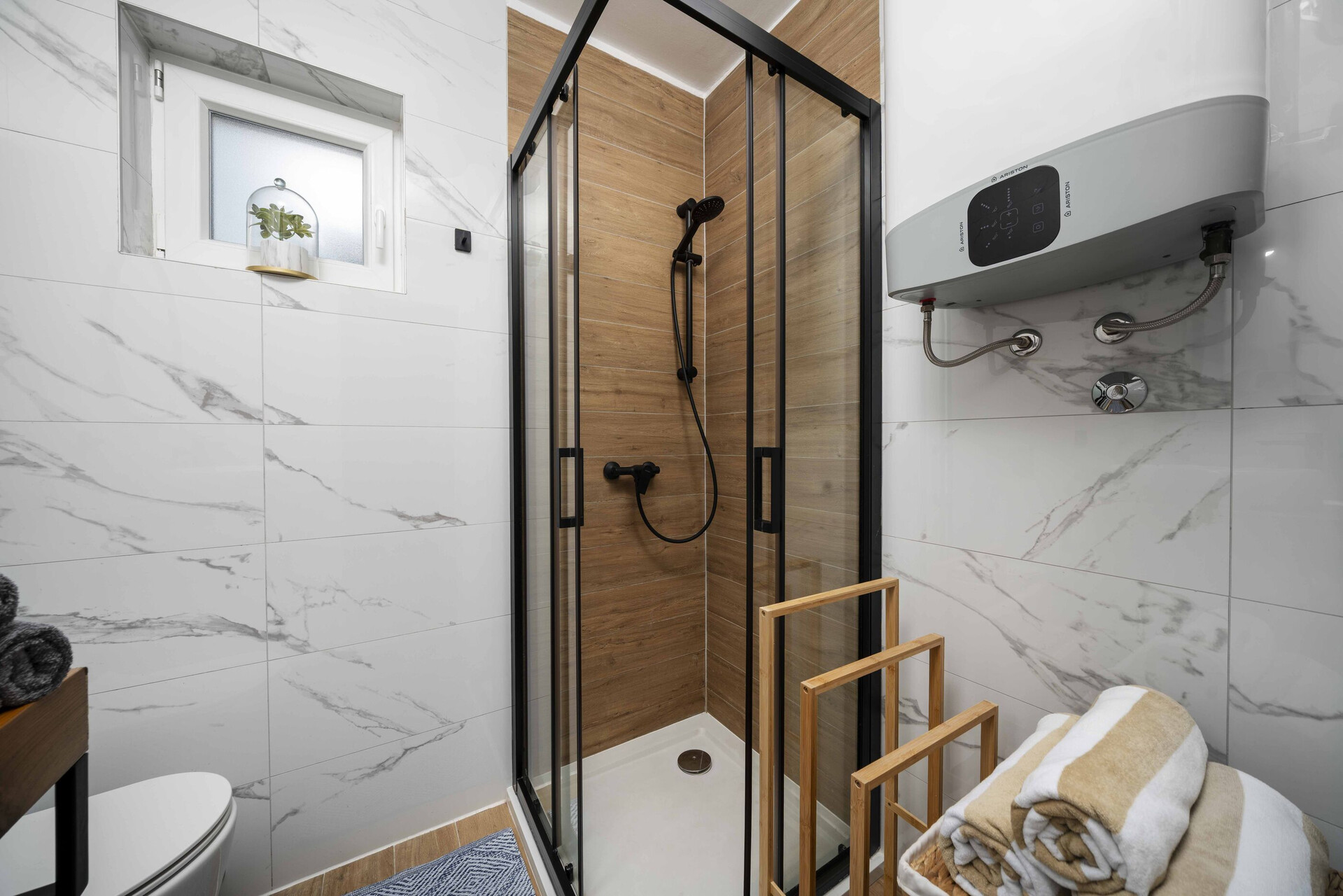 • Dusche, Duschkabine, Handtücher.