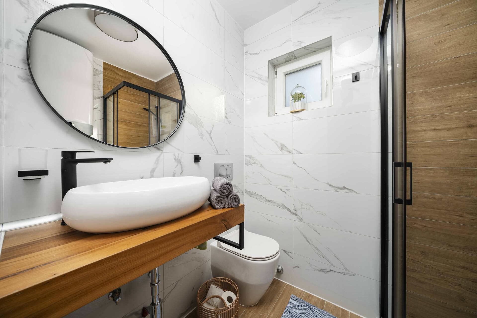 • Dusche, Duschkabine, Waschmaschine, Handtücher.
