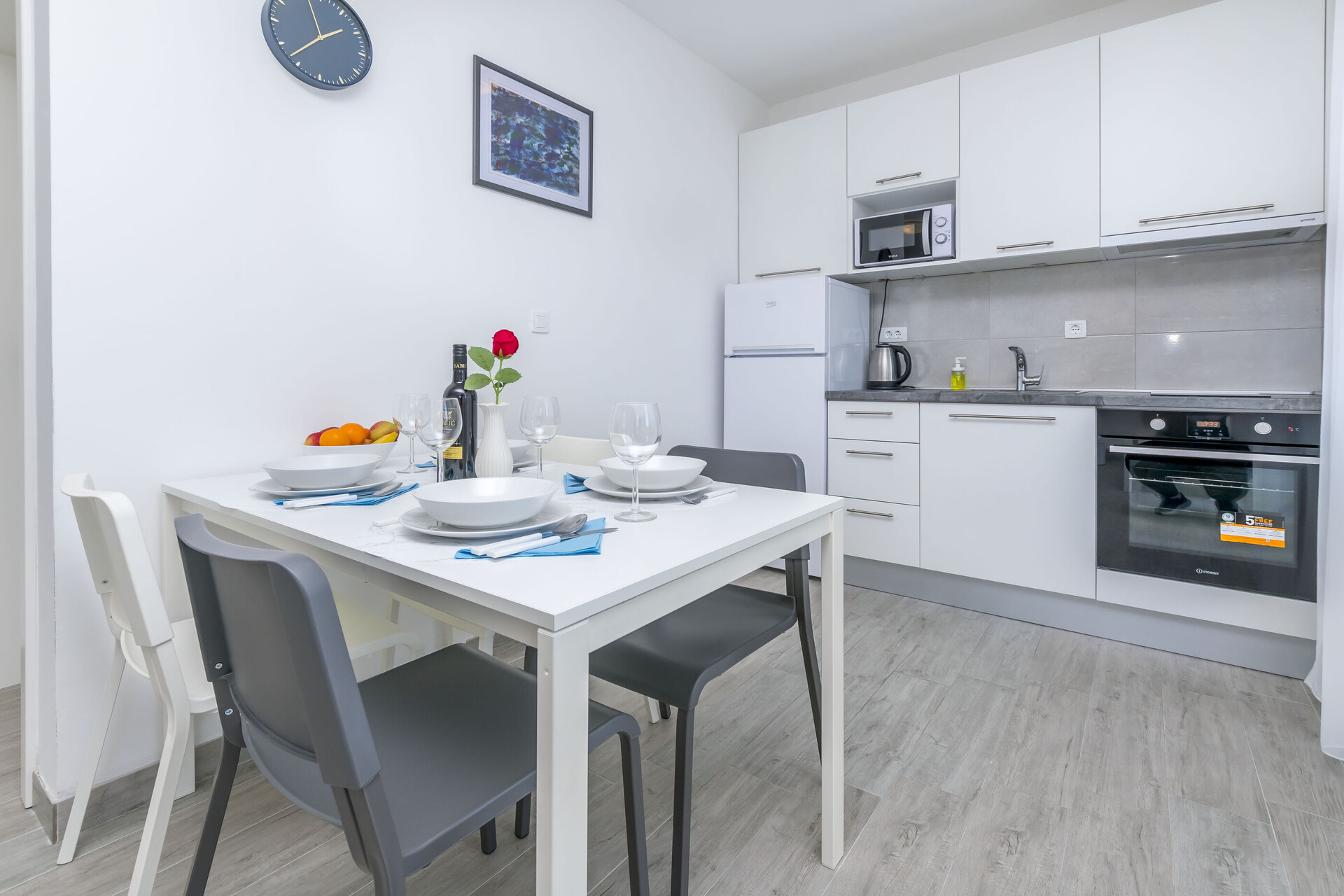 • mesa y sillas, fregadero, horno, nevera, caldera de café, microonda, planchado, estufa de cocina.