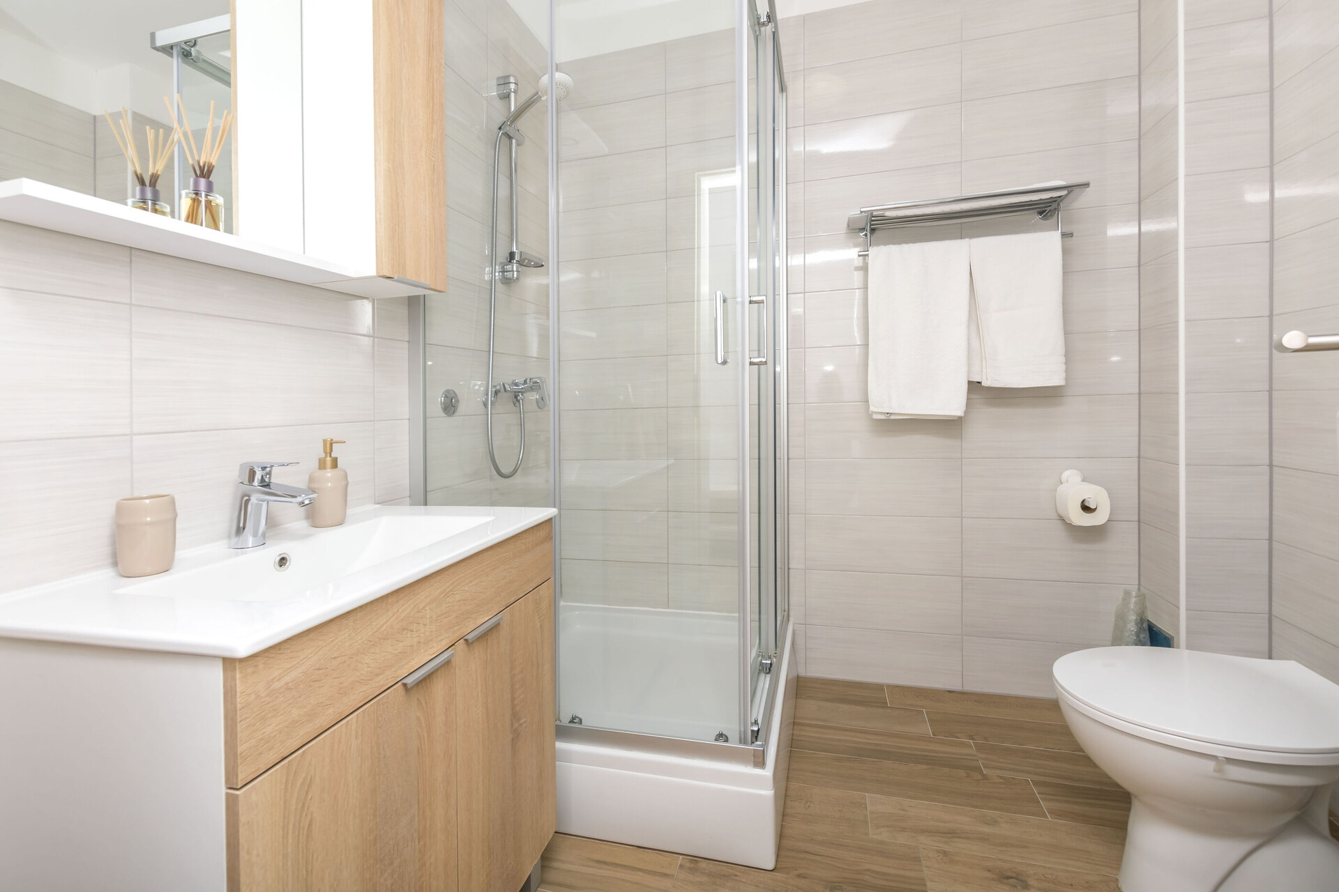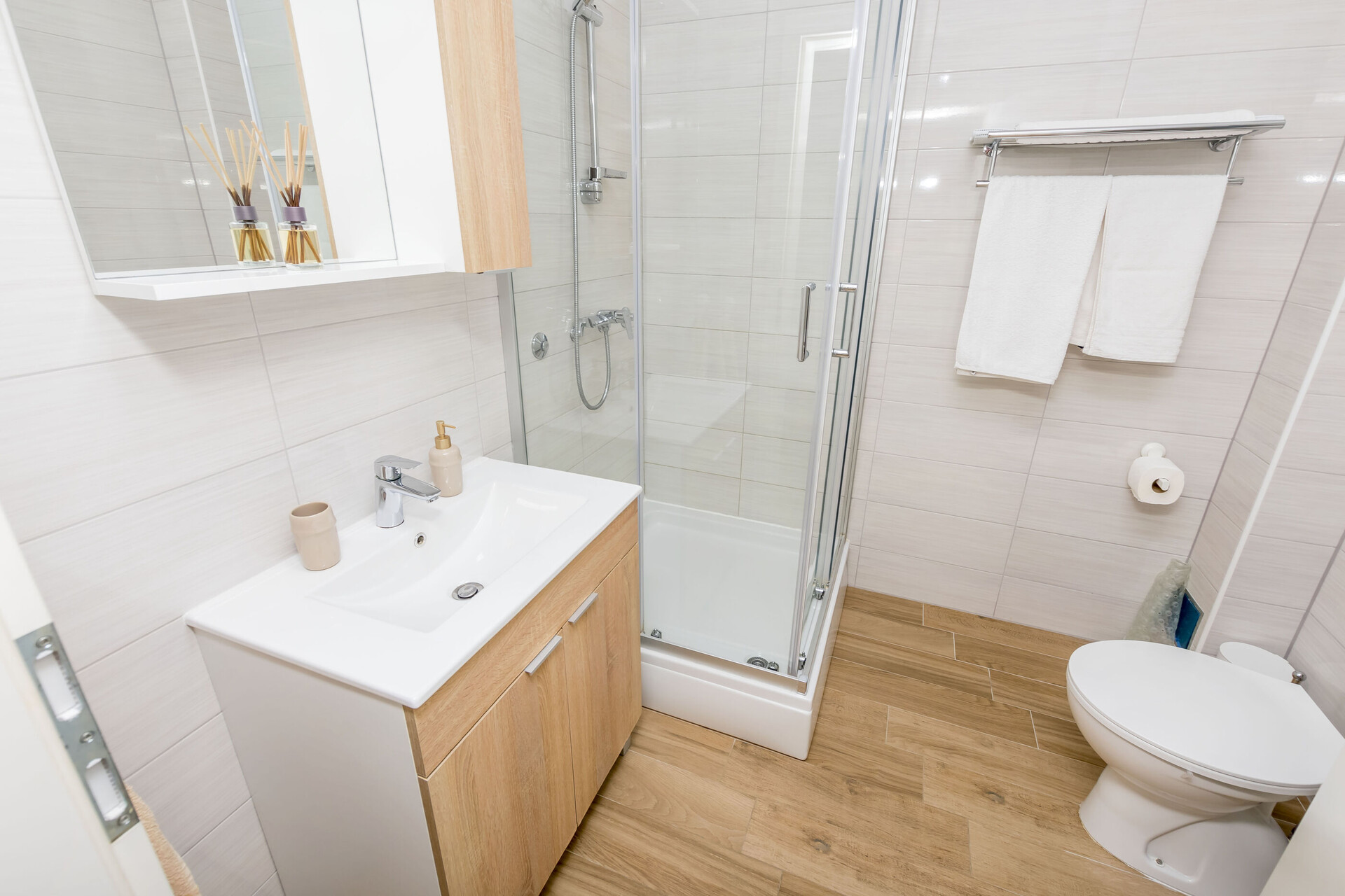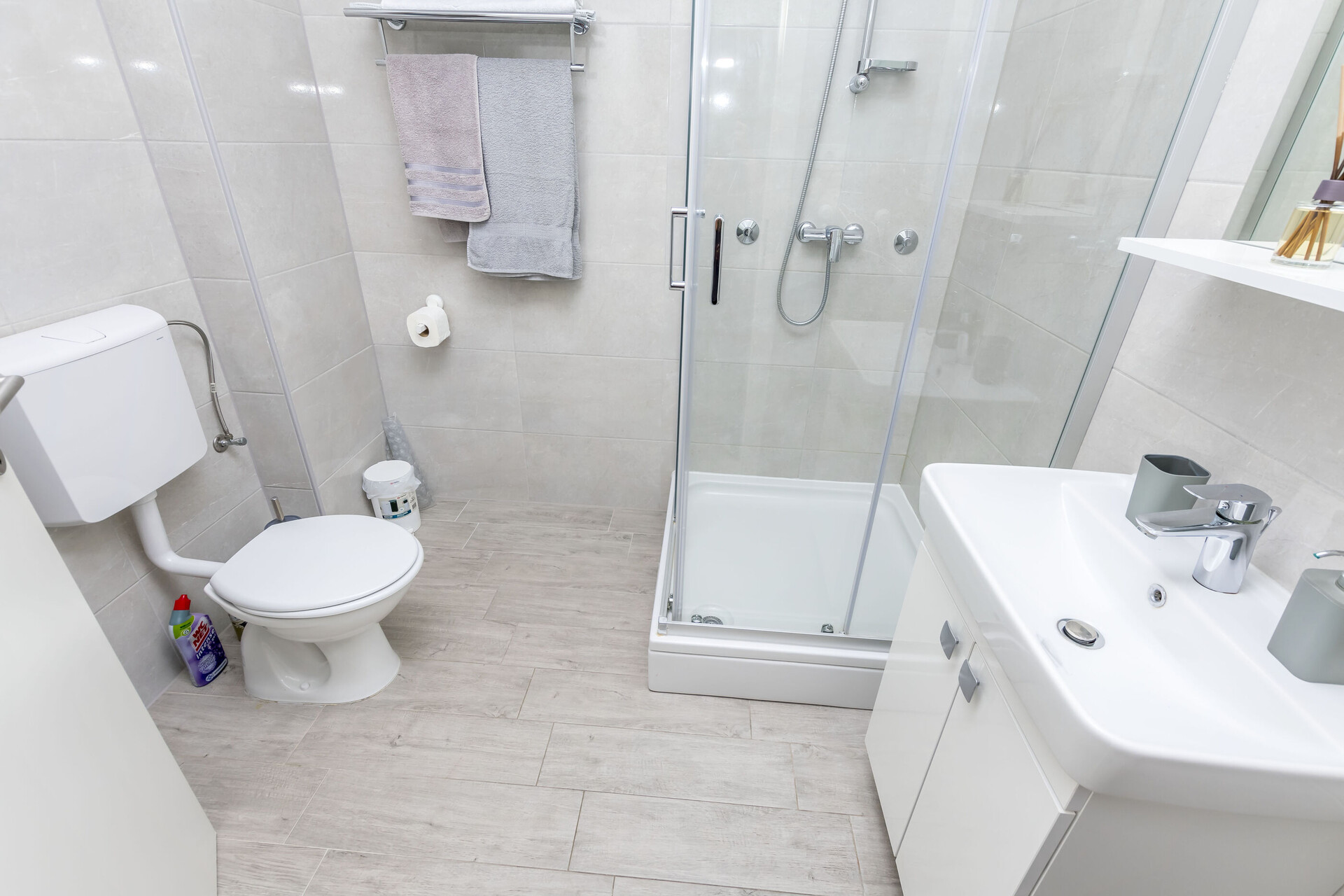 • ducha, cabina de ducha, secadora de pelo, toallas.