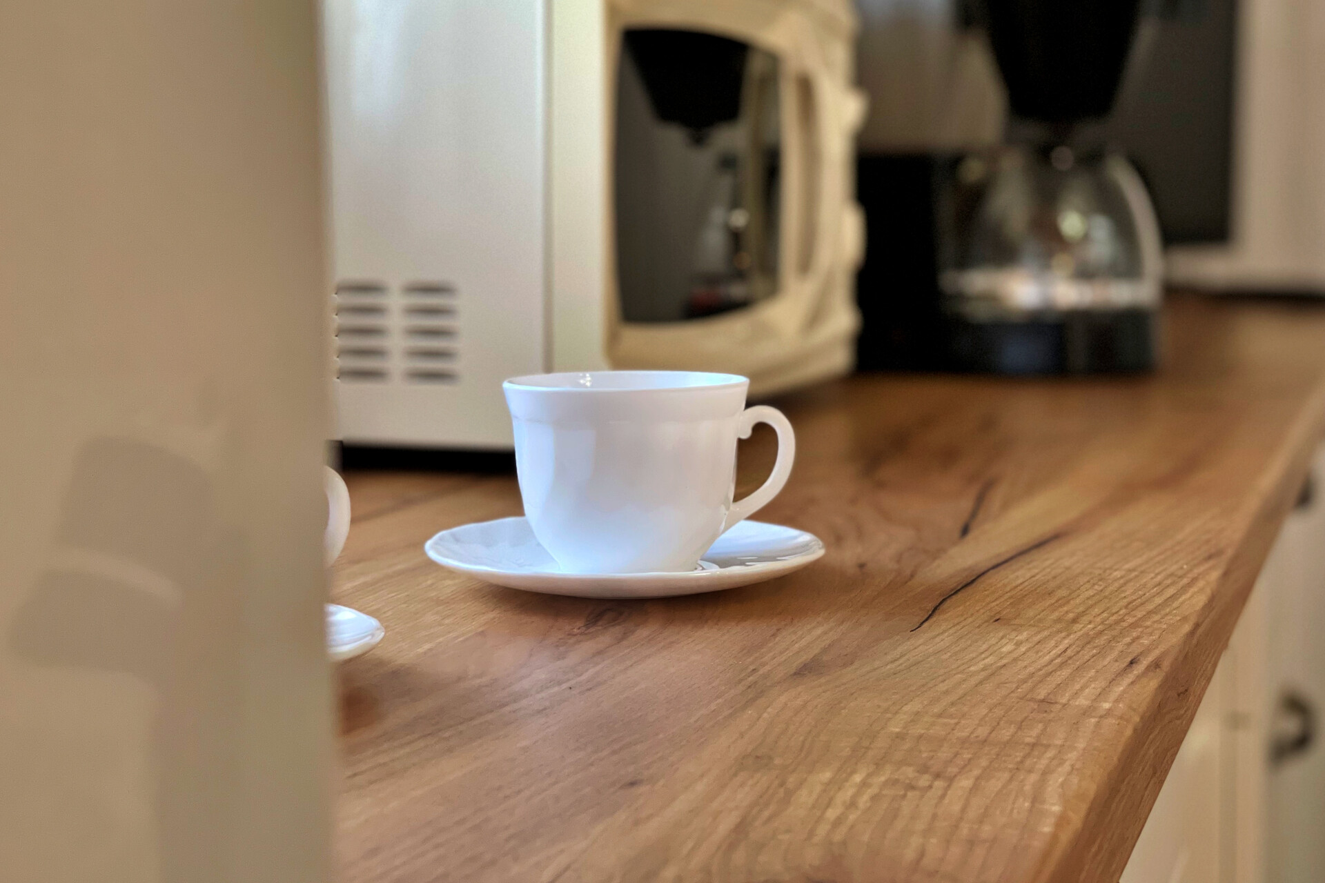 • mesa y sillas, fregadero, horno, nevera, congelador, caldera de café, cafetière, microonda, lavavajillas, planchado, estufa de cocina.