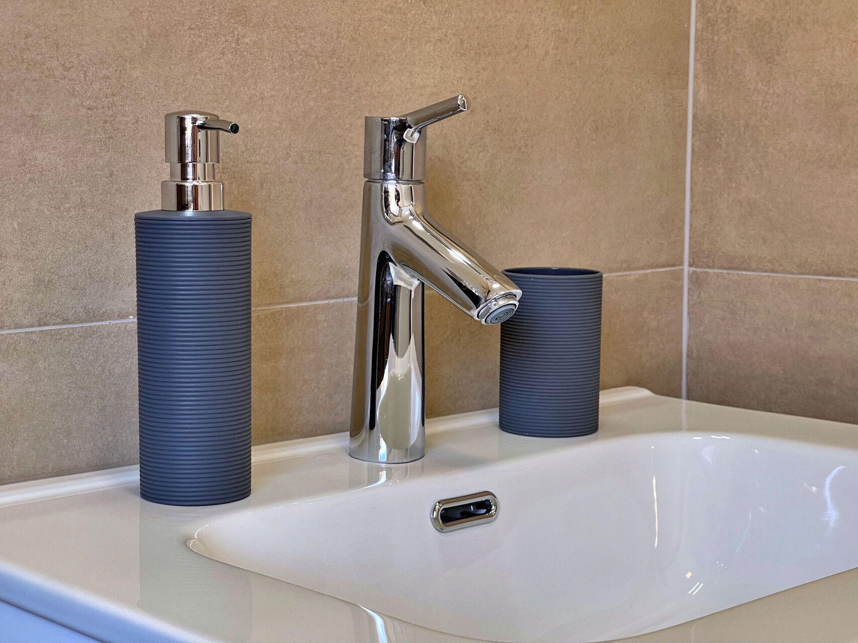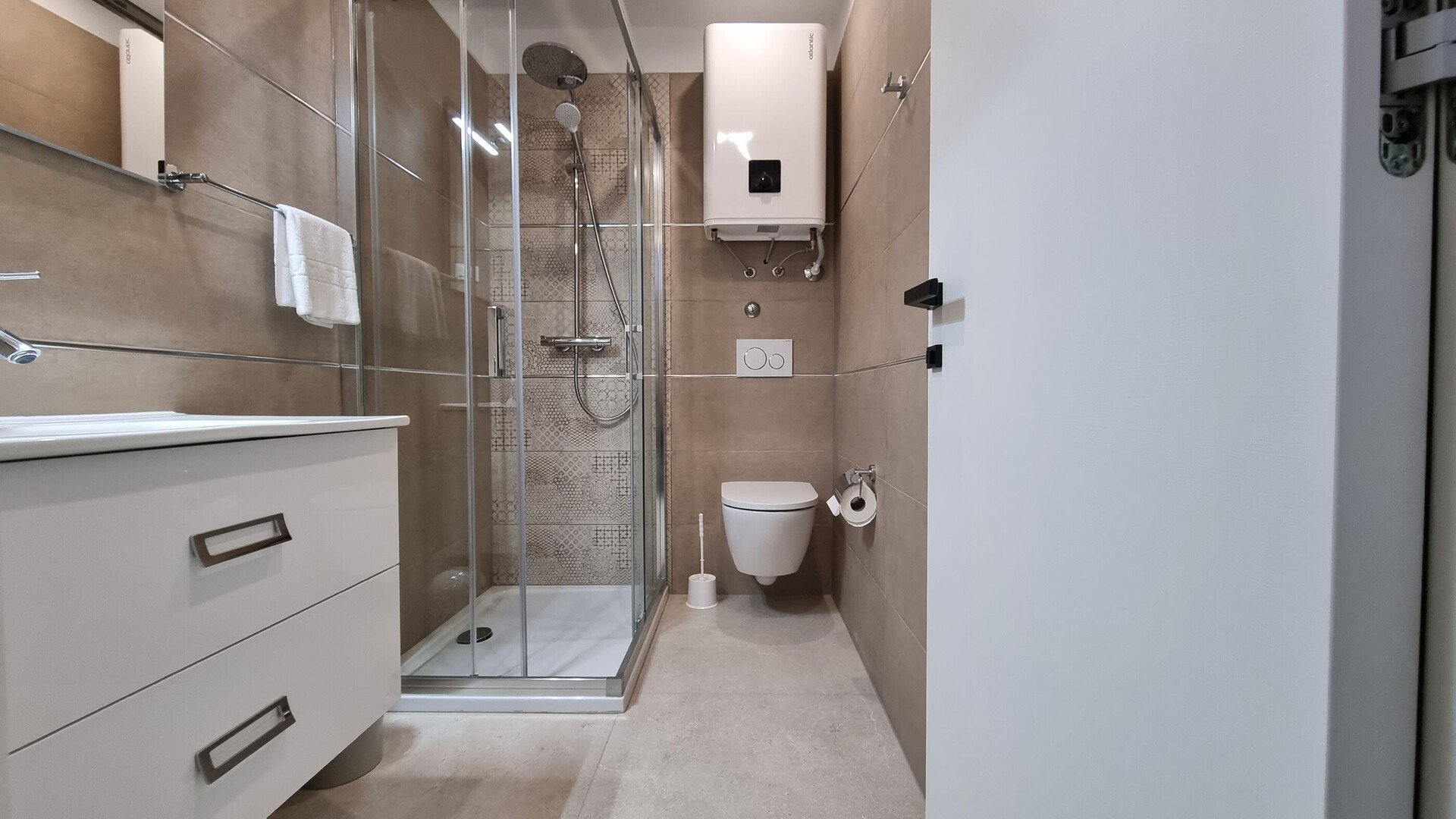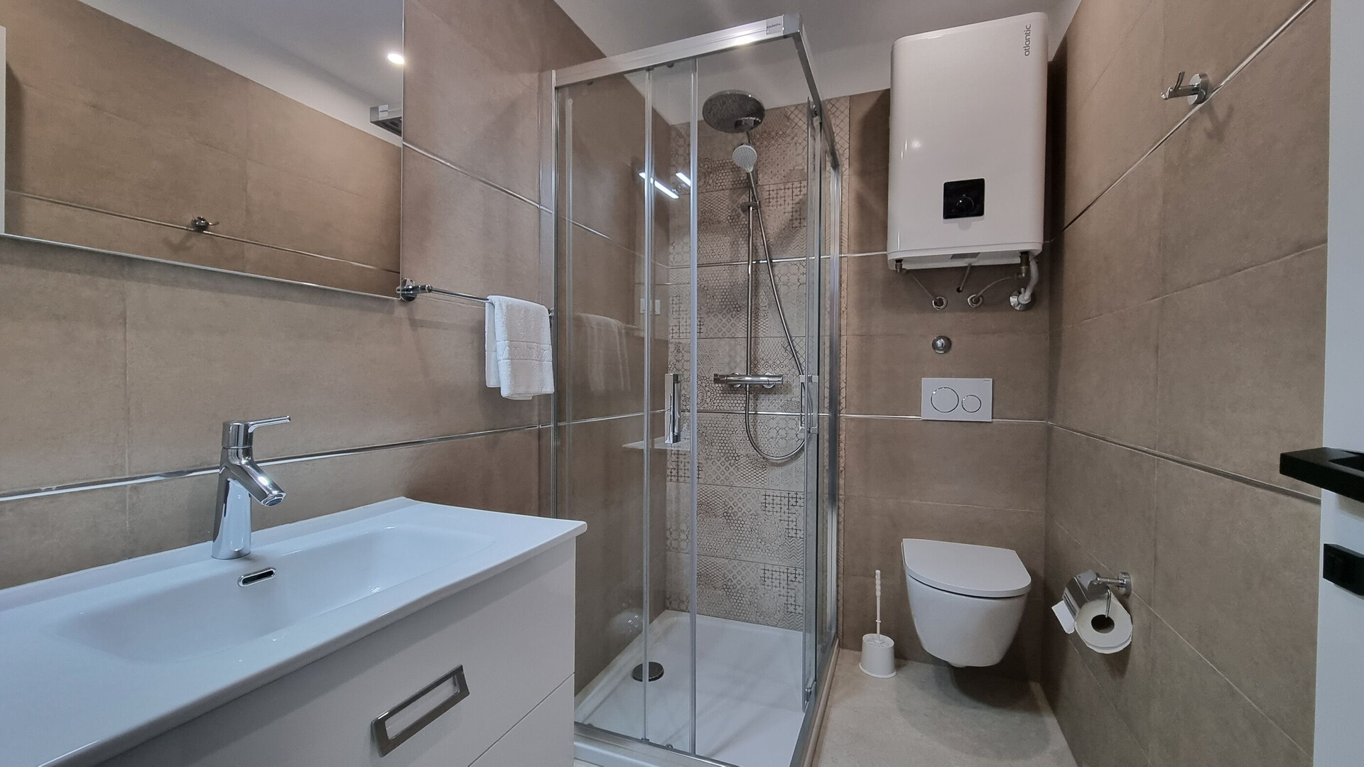 • ducha, cabina de ducha, secadora de pelo, toallas.