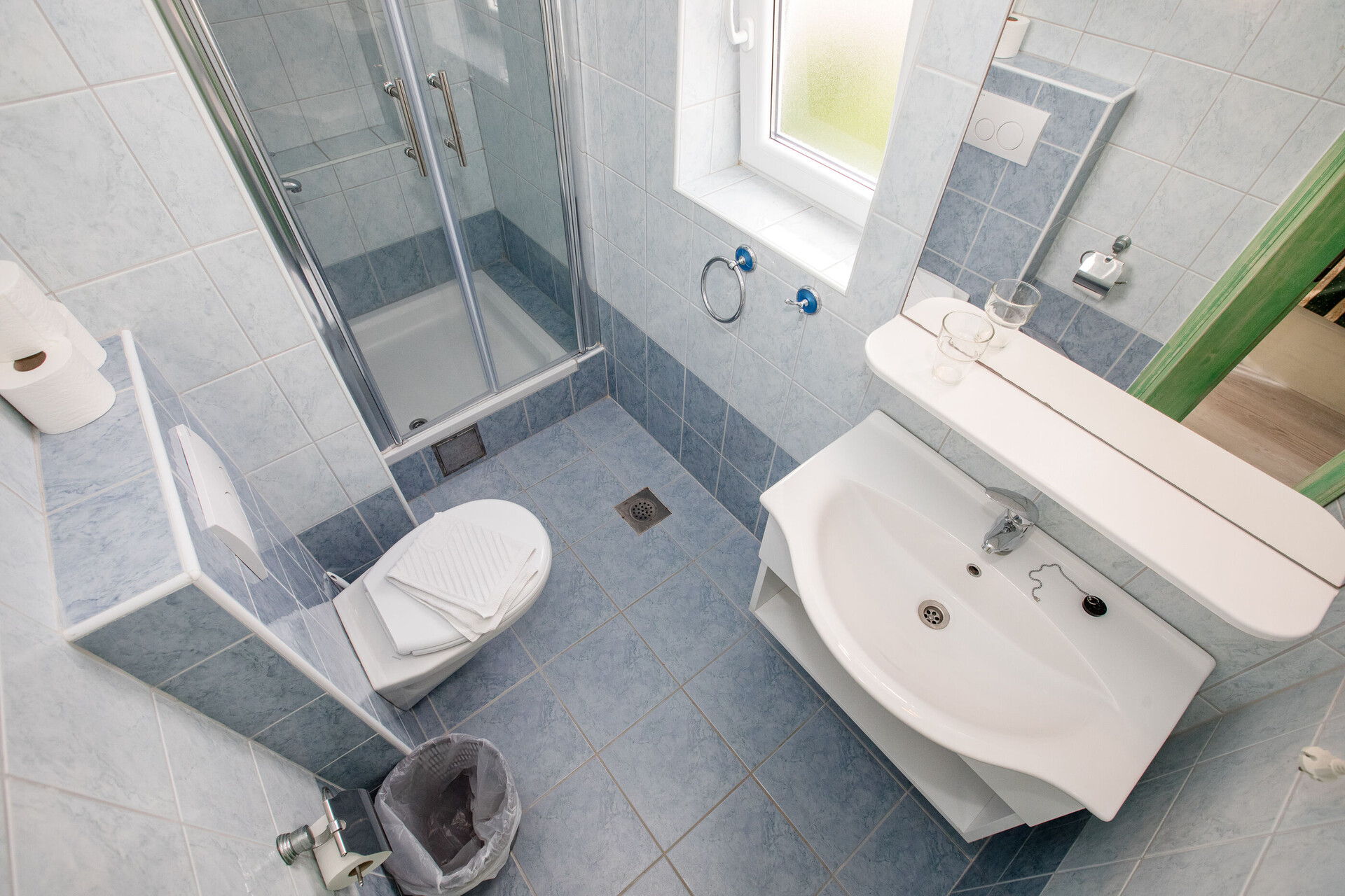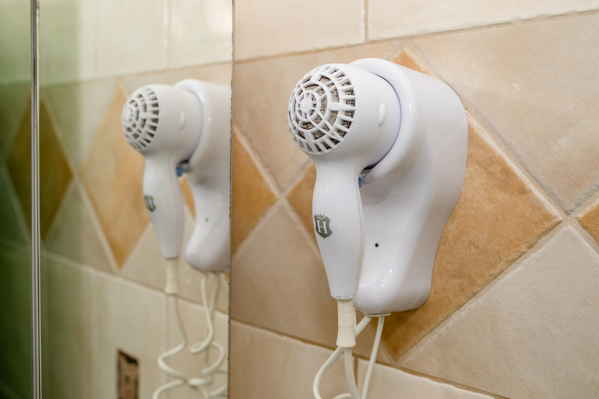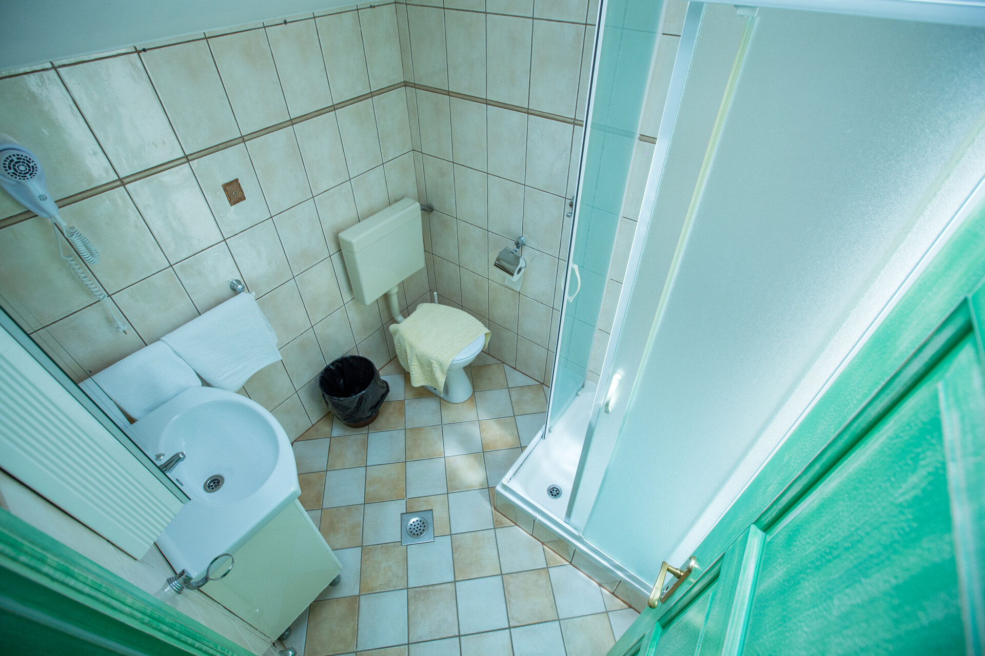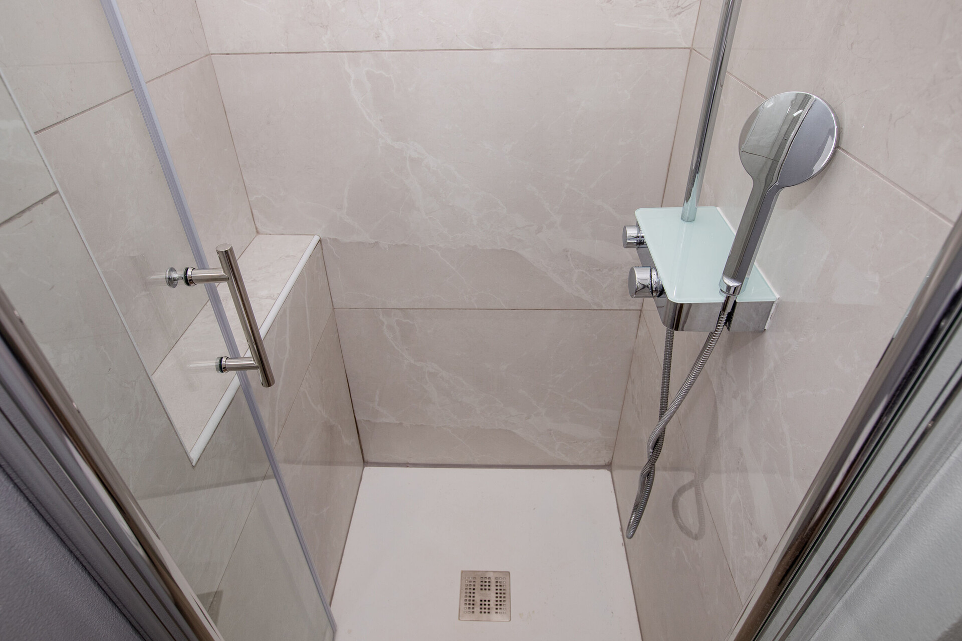 • ducha, cabina de ducha, secadora de pelo, toallas.