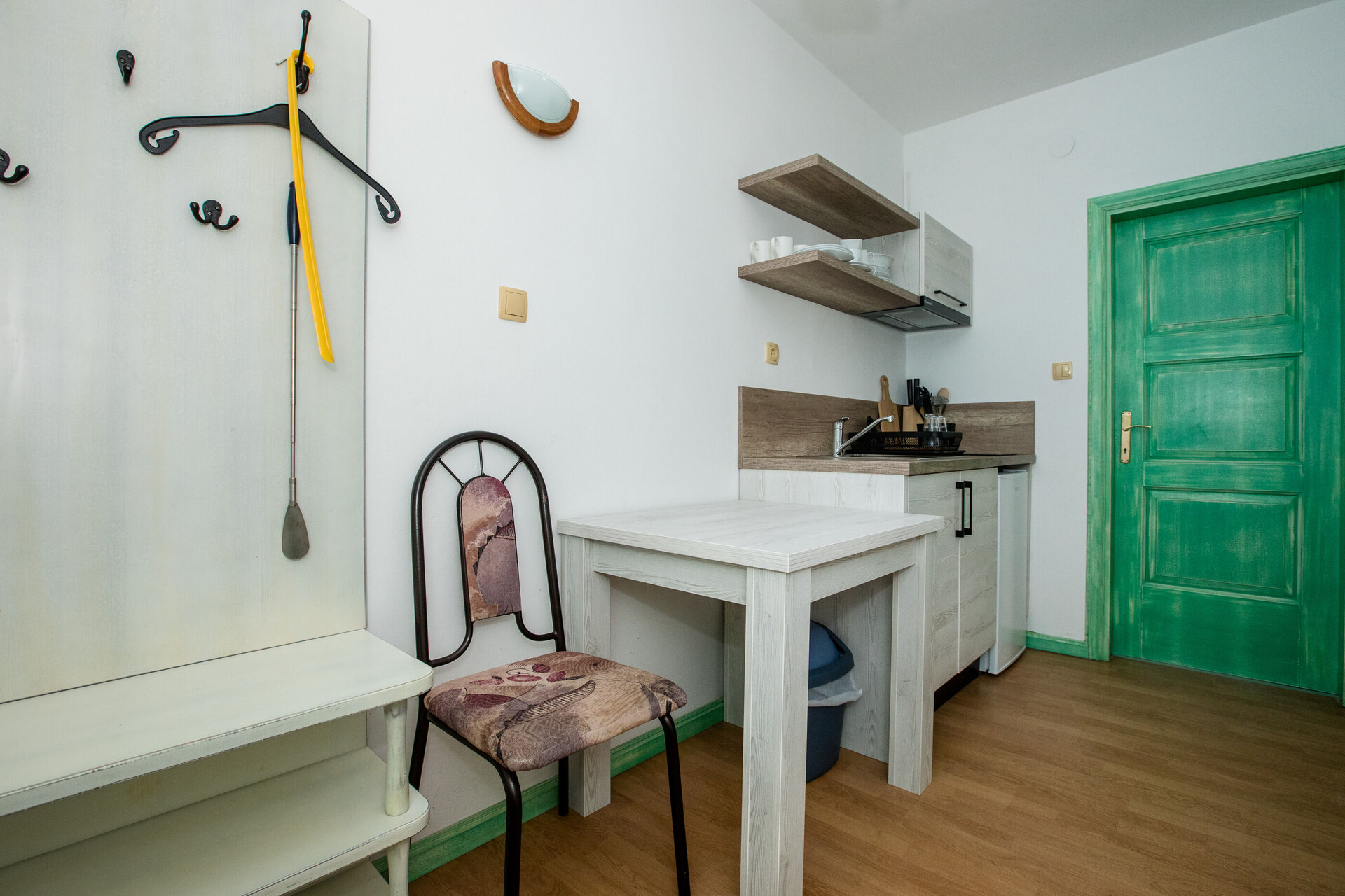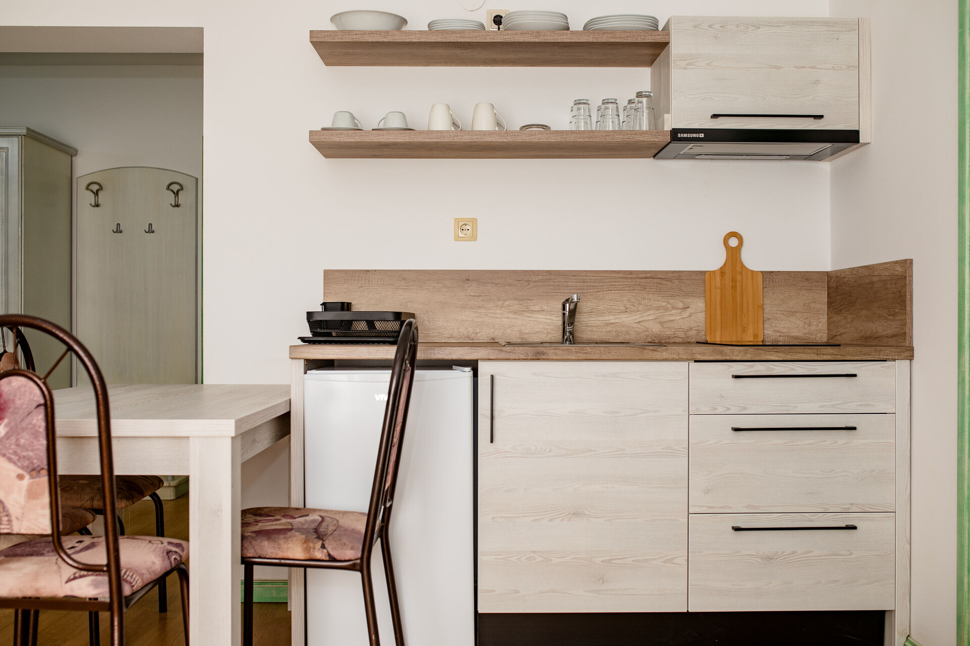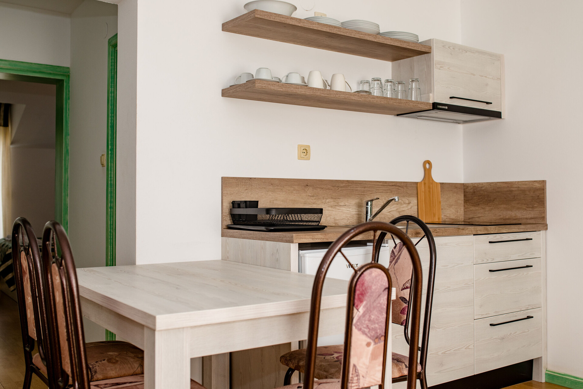 • mesa y sillas, fregadero, nevera, estufa de cocina.
