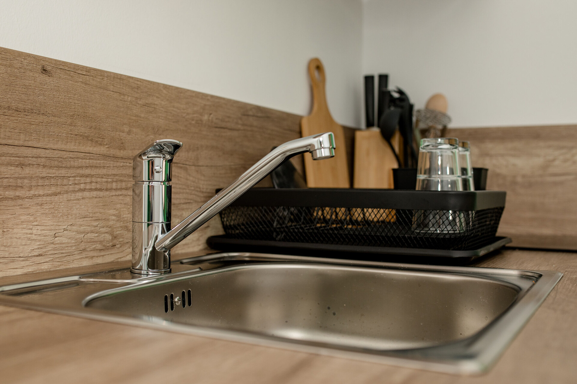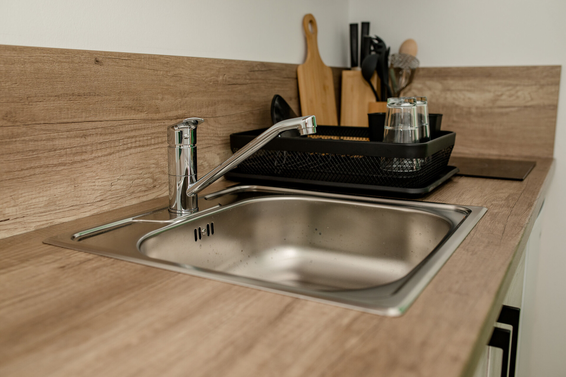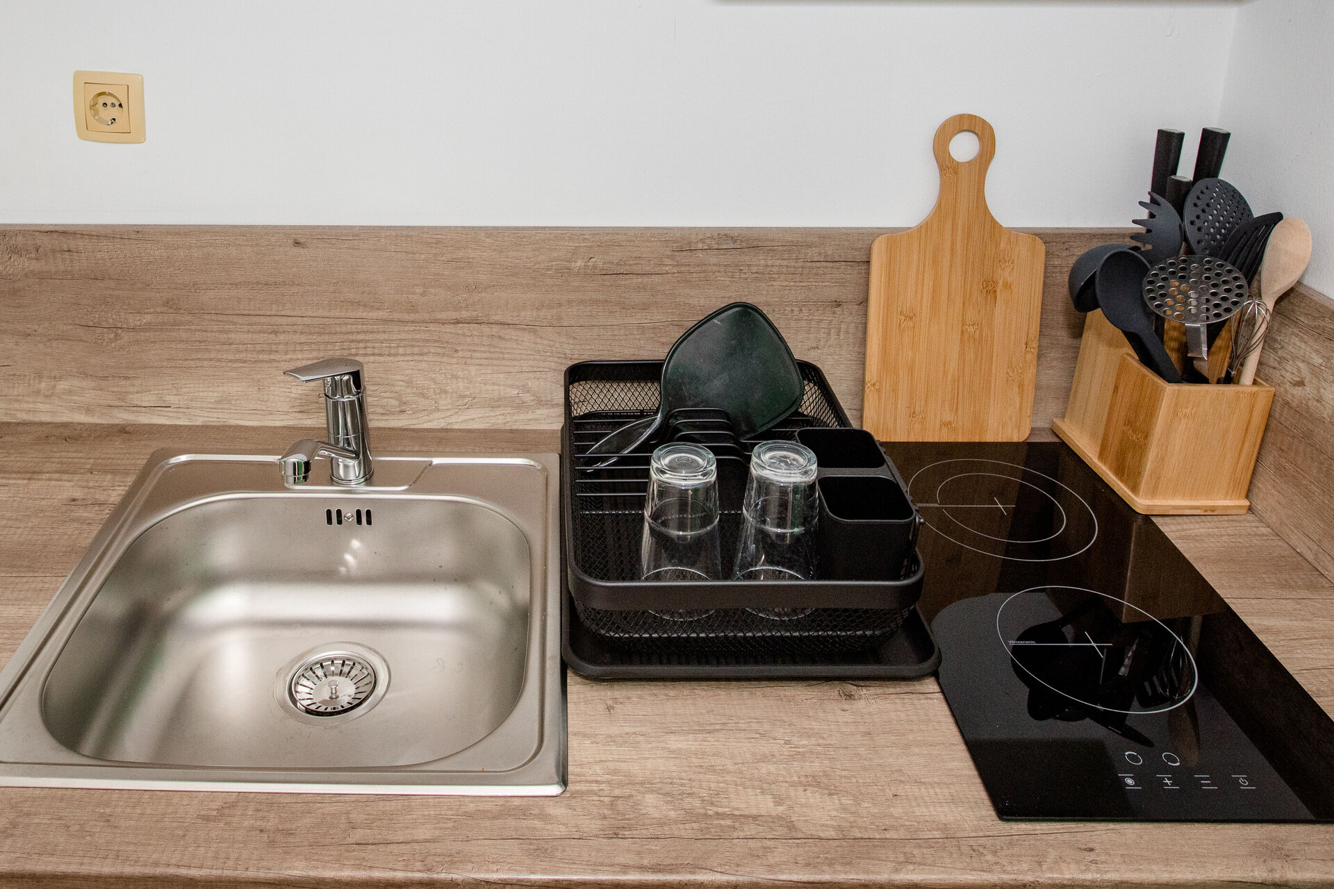 • mesa y sillas, fregadero, nevera, estufa de cocina.