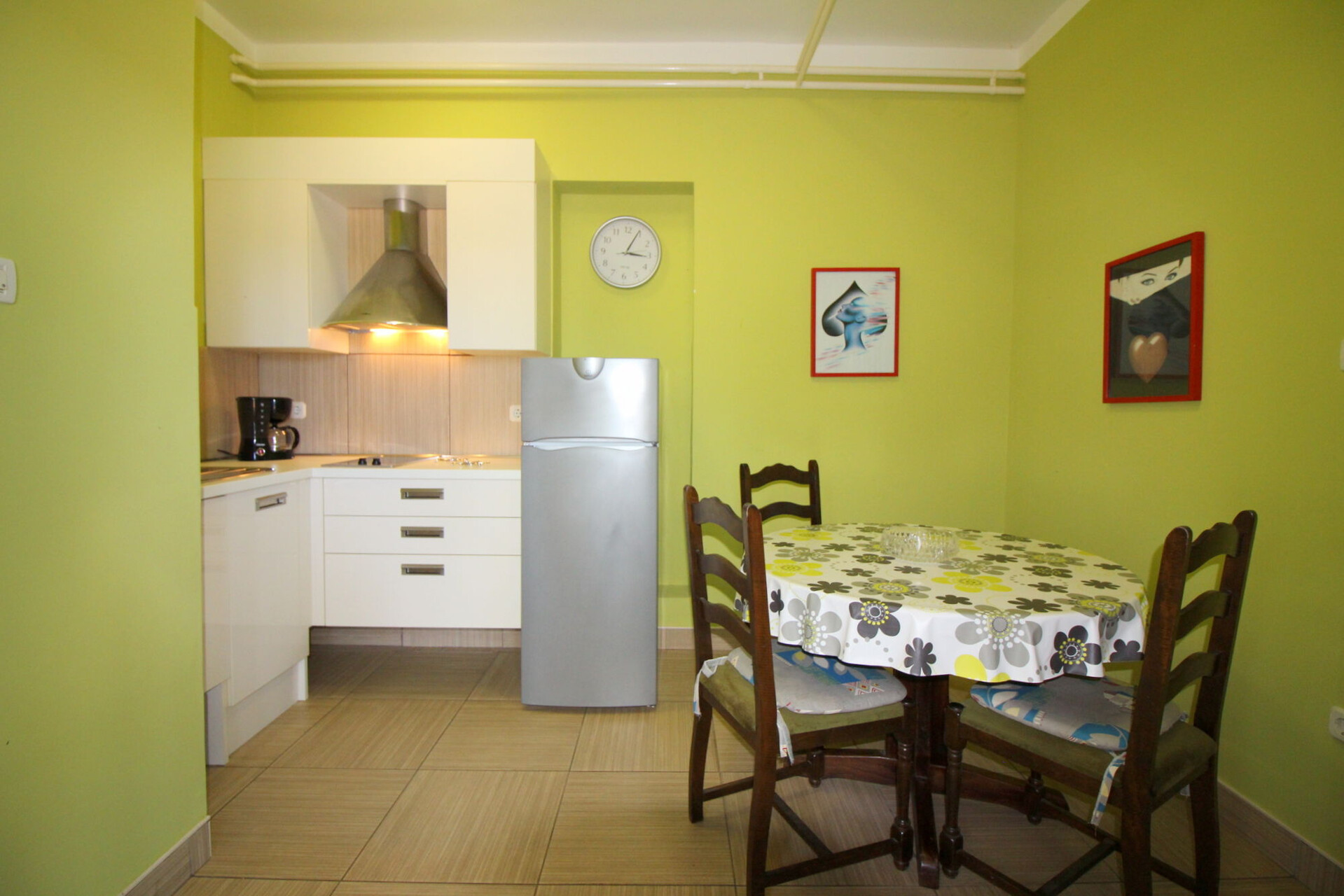 • mesa y sillas, fregadero, nevera, cafetière, estufa de cocina.